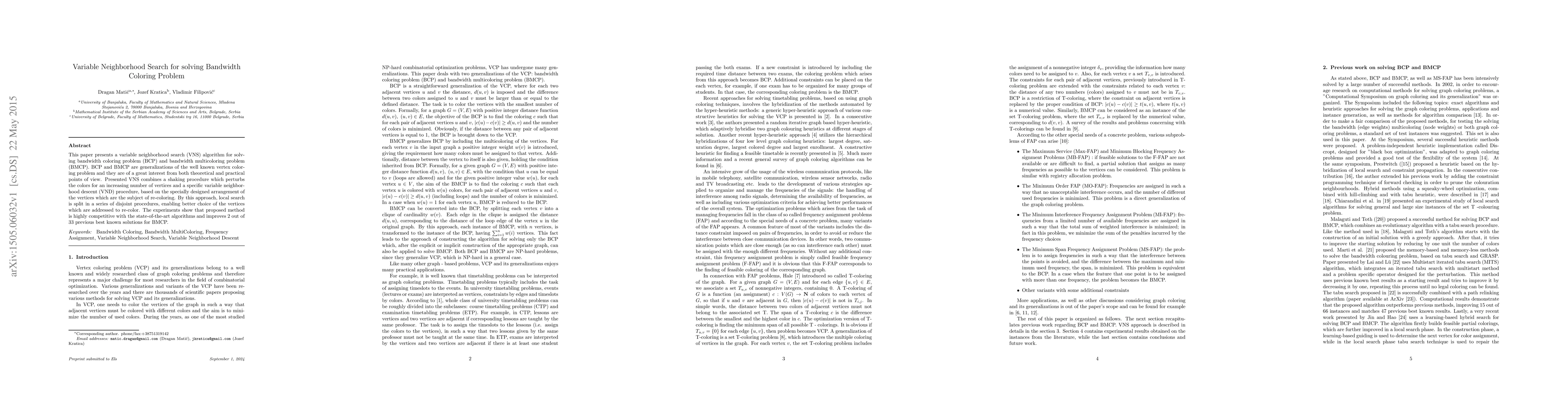 This paper introduces a variable neighborhood search (VNS) algorithm for solving bandwidth coloring and multicoloring problems, showing competitive performance against state-of-the-art methods and improving two best known solutions for multicoloring.