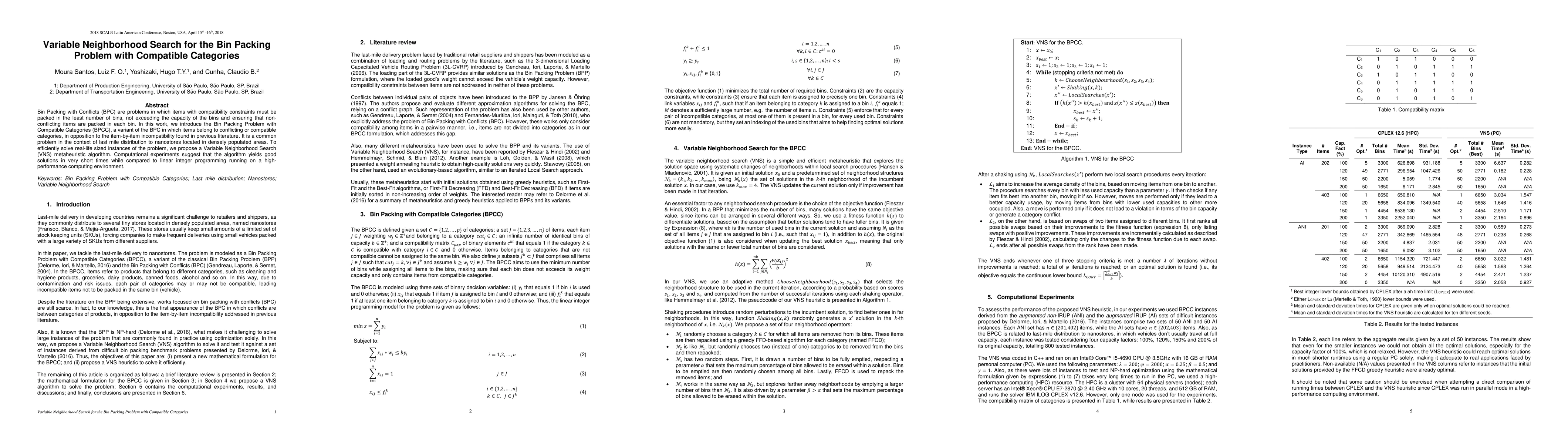 This research introduces a Variable Neighborhood Search (VNS) algorithm for solving the Bin Packing Problem with Compatible Categories (BPCC), which involves packing items with compatibility constraints into bins while minimizing bin usage. The proposed VNS method is shown to efficiently provide good solutions in short times compared to linear integer programming.
