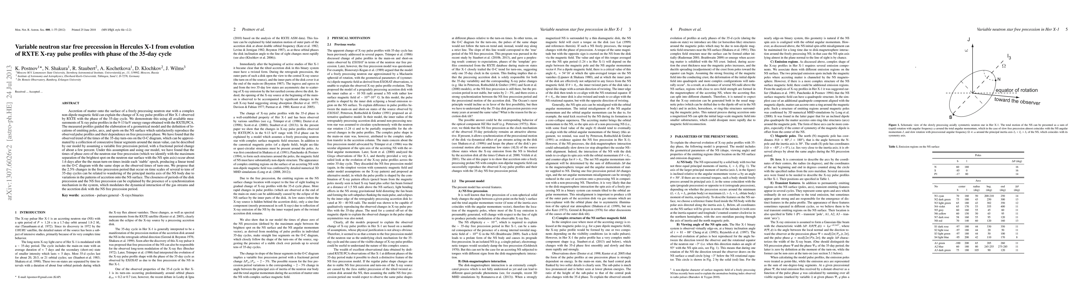 A neutron star's free precession in Hercules X-1 changes with its 35-day cycle, potentially due to variations in accretion patterns. This variability can be explained by a synchronization mechanism that modulates the interaction between the disk and the NS's magnetic field.