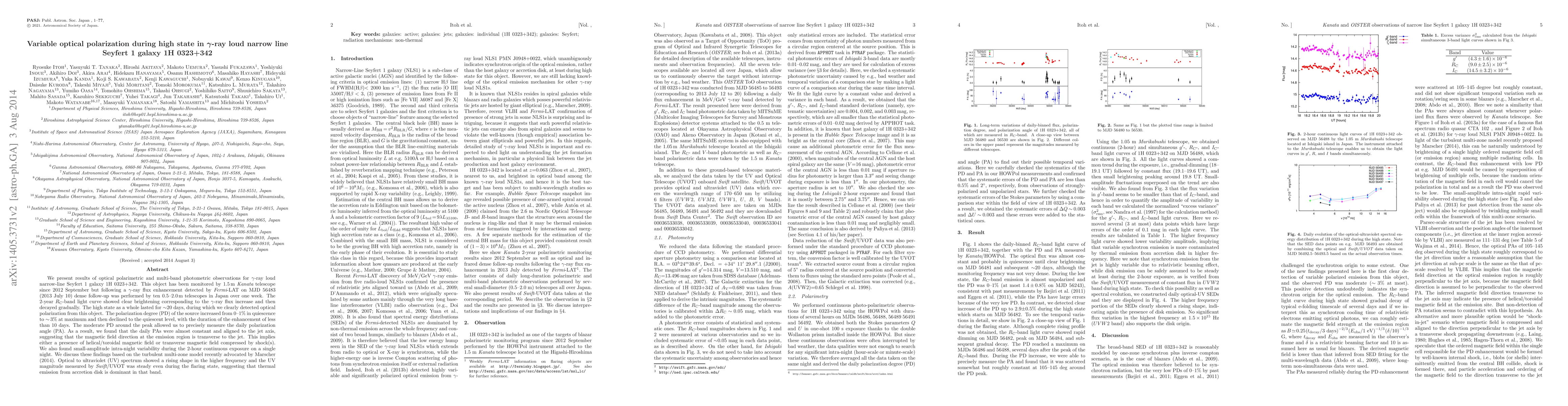 We present results of optical polarimetric and multi-band photometric observations for gamma-ray loud narrow-line Seyfert 1 galaxy 1H 0323+342. This object has been monitored by 1.5 m Kanata telescope since 2012 September but following a gamma-ray flux enhancement detected by Fermi-LAT on MJD 56483 (2013 July 10) dense follow-up was performed by ten 0.5-2.0 m telescopes in Japan over one week. The 2-year R_C-band light curve showed clear brightening corresponding to the gamma-ray flux increase and then decayed gradually. The high state as a whole lasted for ~20 days, during which we clearly detected optical polarization from this object. The polarization degree (PD) of the source increased from 0-1% in quiescence to ~3% at maximum and then declined to the quiescent level, with the duration of the enhancement of less than 10 days. The moderate PD around the peak allowed us to precisely measure the daily polarization angle (PA). As a result, we found that the daily PAs were almost constant and aligned to the jet axis, suggesting that the magnetic field direction at the emission region is transverse to the jet. This implies either a presence of helical/toroidal magnetic field or transverse magnetic field compressed by shock(s). We also found small-amplitude intra-night variability during the 2-hour continuous exposure on a single night. We discuss these findings based on the turbulent multi-zone model recently advocated by Marscher (2014). Optical to ultraviolet (UV) spectrum showed a rising shape in the higher frequency and the UV magnitude measured by Swift/UVOT was steady even during the flaring state, suggesting that thermal emission from accretion disk is dominant in that band.