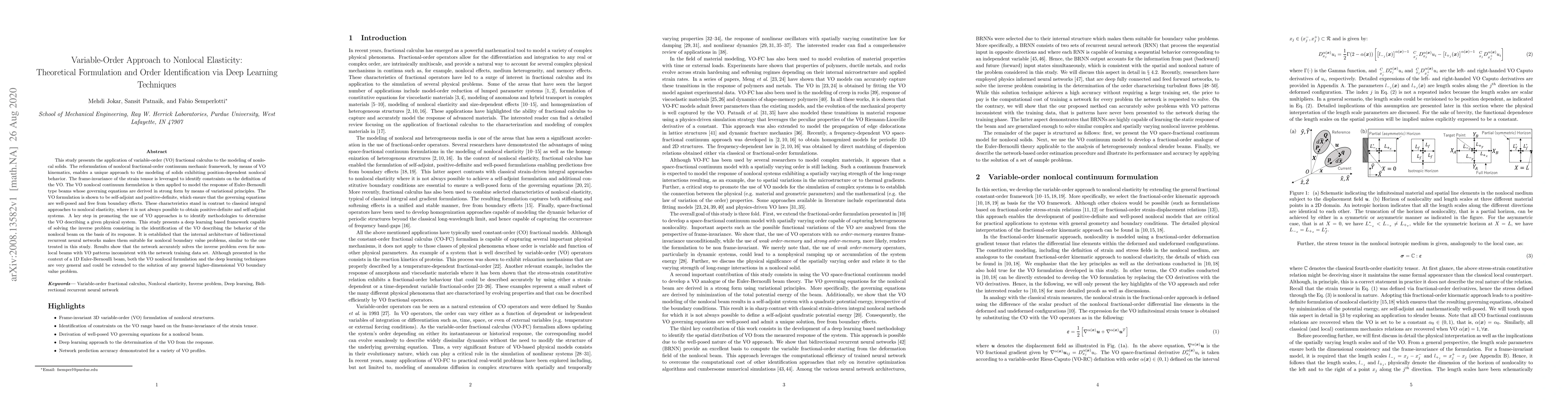 This study presents the application of variable-order (VO) fractional calculus to the modeling of nonlocal solids. The reformulation of nonlocal fractional-order continuum mechanic framework, by means of VO kinematics, enables a unique approach to the modeling of solids exhibiting position-dependent nonlocal behavior. The frame-invariance of the strain tensor is leveraged to identify constraints on the definition of the VO. The VO nonlocal continuum formulation is then applied to model the response of Euler-Bernoulli type beams whose governing equations are derived in strong form by means of variational principles. The VO formulation is shown to be self-adjoint and positive-definite, which ensure that the governing equations are well-posed and free from boundary effects. These characteristics stand in contrast to classical integral approaches to nonlocal elasticity, where it is not always possible to obtain positive-definite and self-adjoint systems. A key step in promoting the use of VO approaches is to identify methodologies to determine the VO describing a given physical system. This study presents a deep learning based framework capable of solving the inverse problem consisting in the identification of the VO describing the behavior of the nonlocal beam on the basis of its response. It is established that the internal architecture of bidirectional recurrent neural networks makes them suitable for nonlocal boundary value problems, similar to the one treated in this study. Results show that the network accurately solves the inverse problem even for nonlocal beams with VO patterns inconsistent with the network training data set. Although presented in the context of a 1D Euler-Bernoulli beam, both the VO nonlocal formulation and the deep learning techniques are very general and could be extended to the solution of any general higher-dimensional VO boundary value problem.