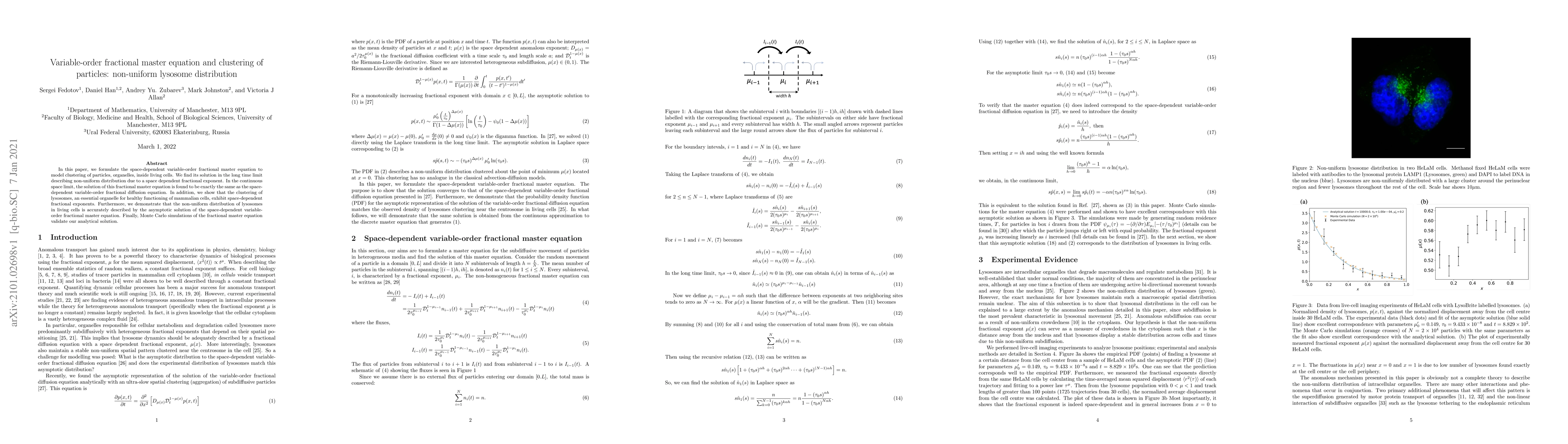 In this paper, we formulate the space-dependent variable-order fractional master equation to model clustering of particles, organelles, inside living cells. We find its solution in the long time limit describing non-uniform distribution due to a space dependent fractional exponent. In the continuous space limit, the solution of this fractional master equation is found to be exactly the same as the space-dependent variable-order fractional diffusion equation. In addition, we show that the clustering of lysosomes, an essential organelle for healthy functioning of mammalian cells, exhibit space-dependent fractional exponents. Furthermore, we demonstrate that the non-uniform distribution of lysosomes in living cells is accurately described by the asymptotic solution of the space-dependent variable-order fractional master equation. Finally, Monte Carlo simulations of the fractional master equation validate our analytical solution.