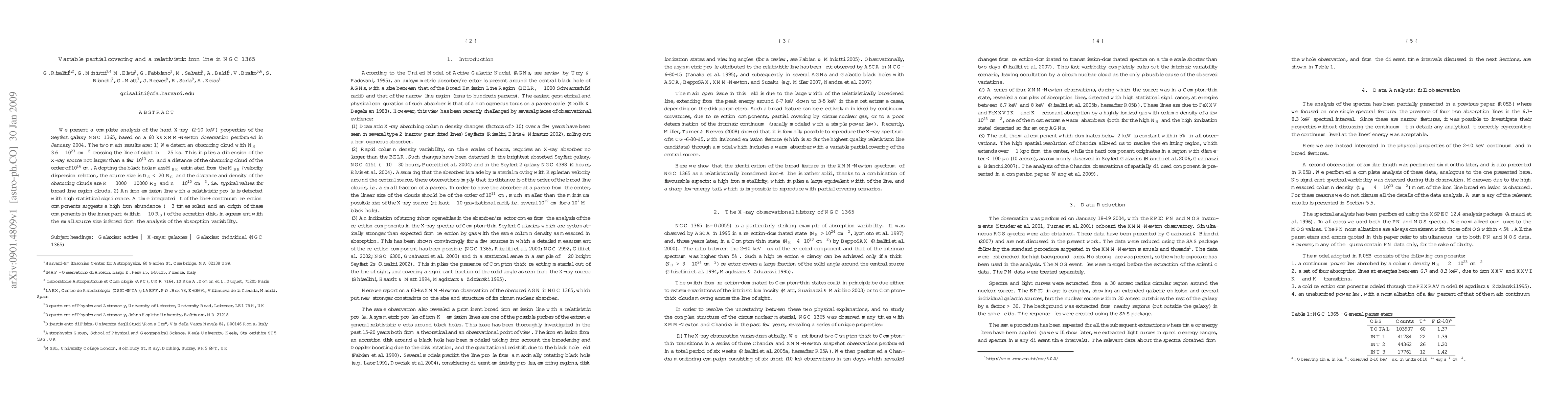 We present a complete analysis of the hard X-ray (2-10 keV) properties of the Seyfert galaxy NGC 1365, based on a 60 ks XMM-Newton observation performed in January 2004. The two main results are: 1) We detect an obscuring cloud with N_H~3.5x10^23 cm^(-2) crossing the line of sight in ~25 ks. This implies a dimension of the X-ray source not larger than a few 10^13 cm and a distance of the obscuring cloud of the order of 10^16 cm. Adopting the black hole mass M(BH) estimated from the M(BH)-velocity dispersion relation, the source size is D_S<20 R_G and the distance and density of the obscuring clouds are R~3000-10000 R_G and n~10^(10) cm^(-3), i.e. typical values for broad line region clouds. 2) An iron emission line with a relativistic profile is detected with high statistical significance. A time integrated fit of the line+continuum reflection components suggests a high iron abundance (~3 times solar) and an origin of these components in the inner part (~10 R_G) of the accretion disk, in agreement with the small source size inferred from the analysis of the absorption variability.