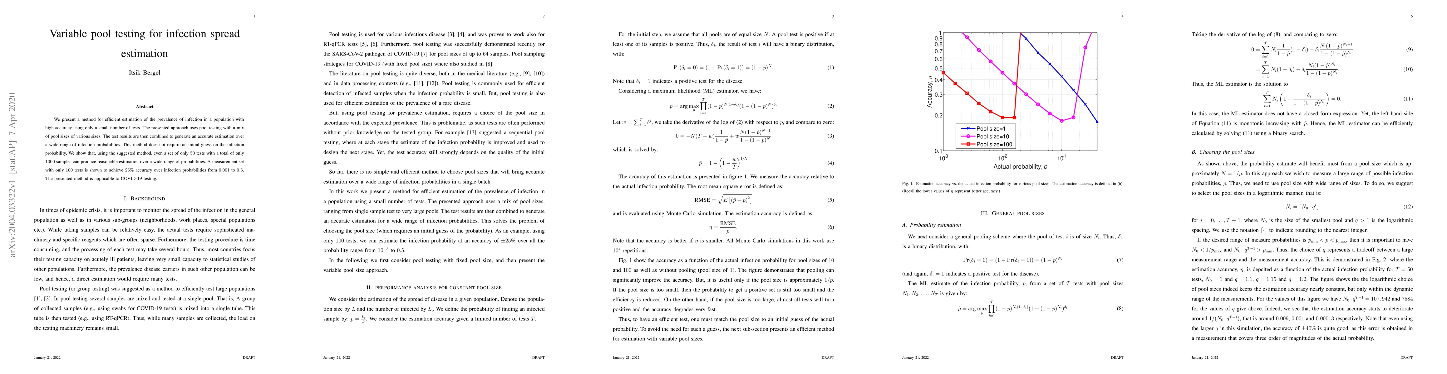 This paper introduces a variable pool testing method for estimating infection prevalence with high accuracy using minimal tests. It combines different pool sizes to generate precise estimates across a wide range of infection probabilities without requiring an initial guess, demonstrating effectiveness with as few as $100$ tests.