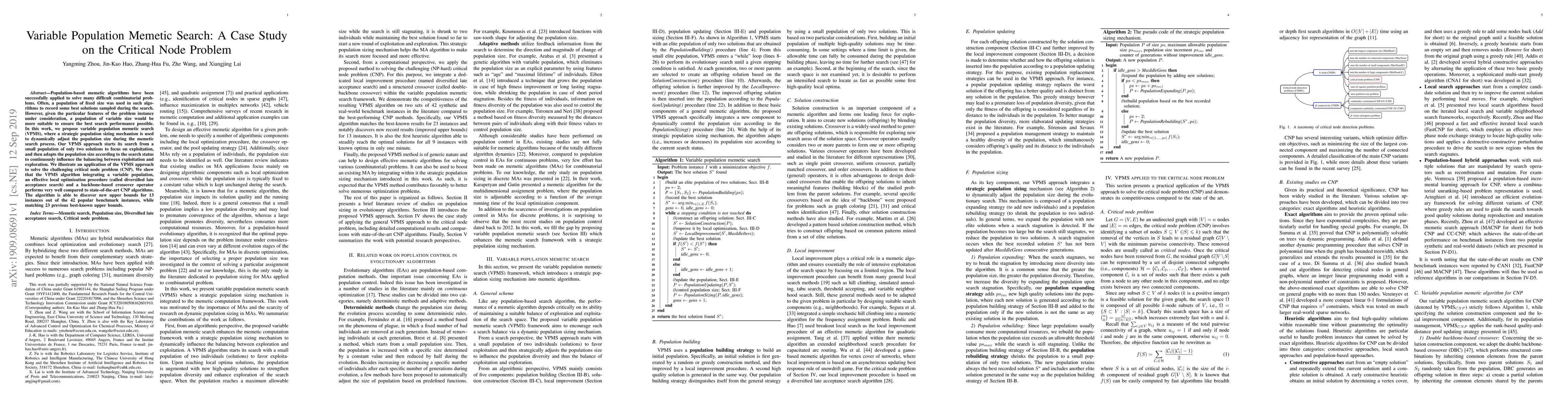 This paper proposes a variable population memetic search (VPMS) algorithm that dynamically adjusts population size to balance exploitation and exploration, achieving superior performance on the critical node problem (CNP) compared to existing methods. The VPMS algorithm discovers new upper bounds for 13 out of 42 benchmark instances and matches the best-known upper bounds for the remaining.