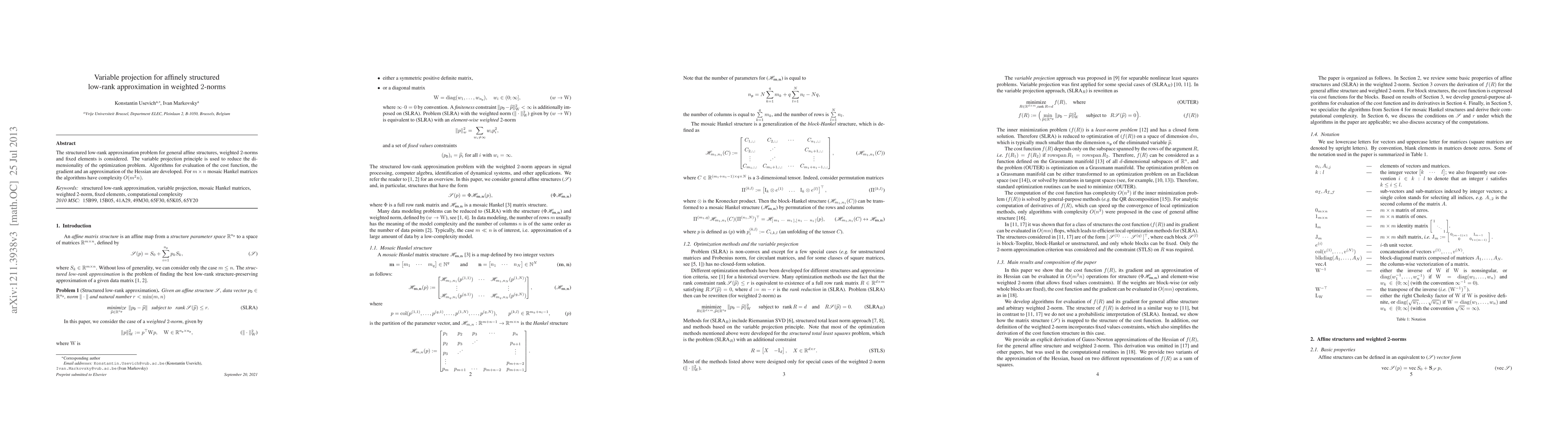 The structured low-rank approximation problem for general affine structures, weighted 2-norms and fixed elements is considered. The variable projection principle is used to reduce the dimensionality of the optimization problem. Algorithms for evaluation of the cost function, the gradient and an approximation of the Hessian are developed. For $m \times n$ mosaic Hankel matrices the algorithms have complexity $O(m^2 n)$.