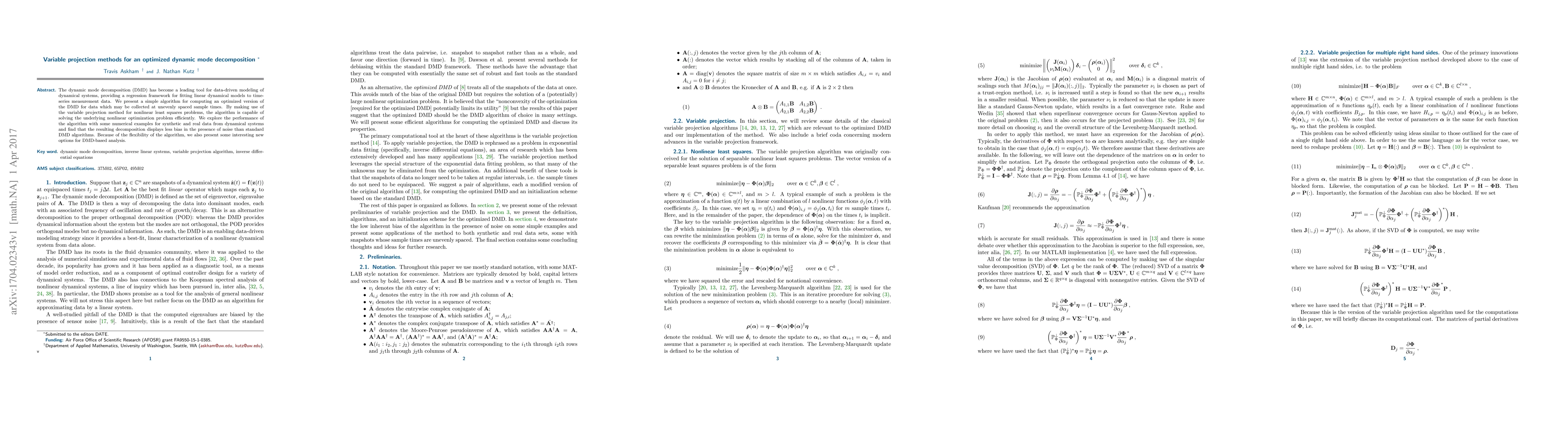 This paper introduces an optimized version of dynamic mode decomposition (DMD) using variable projection methods for nonlinear least squares, suitable for unevenly spaced data. The proposed algorithm shows reduced bias in noisy data compared to standard DMD, offering new analytical possibilities for dynamical systems.