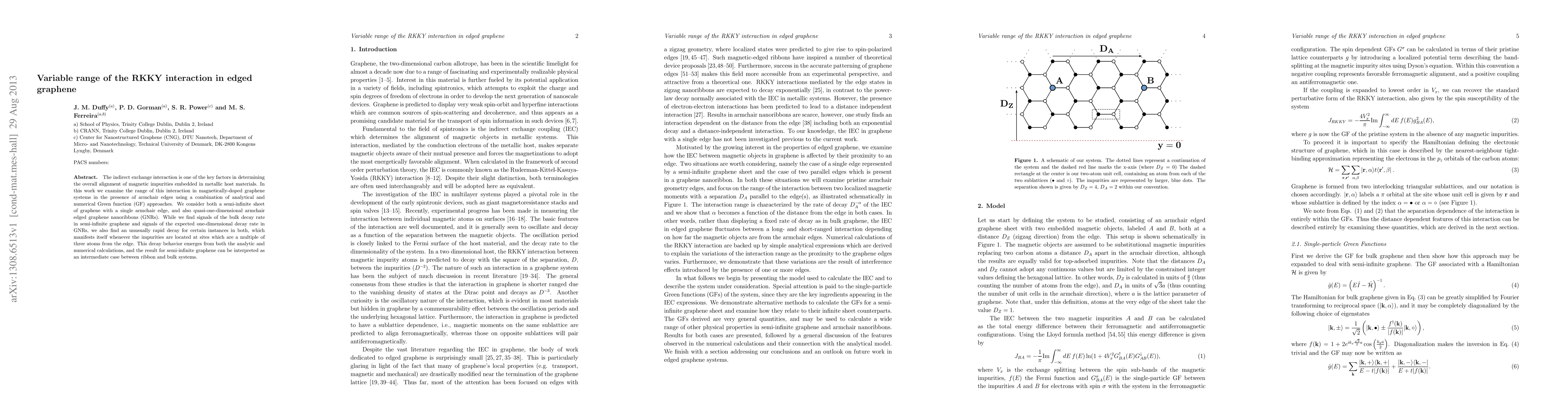 This study investigates the RKKY interaction range in magnetically-doped graphene with armchair edges, revealing an unusually rapid decay when impurities are located three atoms away from the edge. This behavior is observed in both semi-infinite graphene sheets and armchair edged nanoribbons, suggesting an intermediate interaction range between bulk and one-dimensional systems.