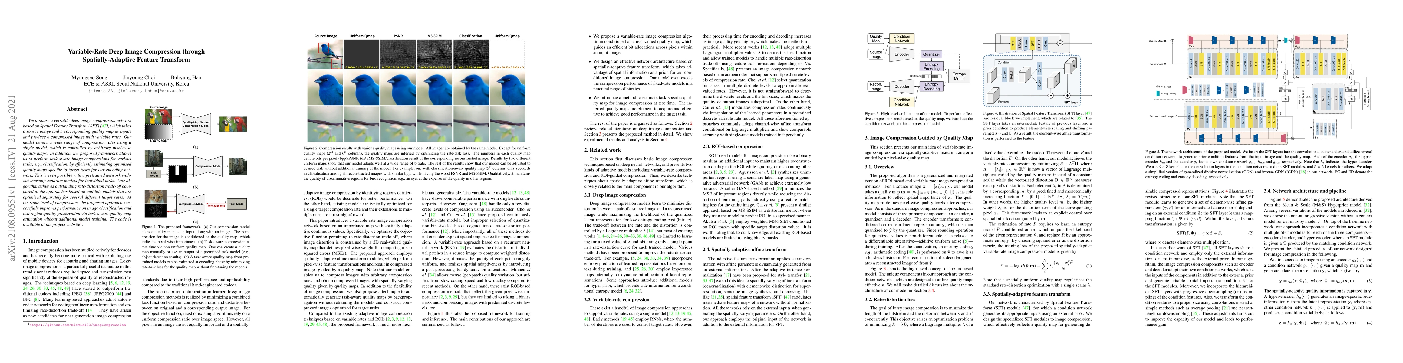 This paper introduces a deep image compression network utilizing Spatial Feature Transform, enabling variable-rate compression controlled by pixel-wise quality maps. It achieves a superior rate-distortion trade-off, enhances task-specific performance, and maintains high classification accuracy and text region quality without additional training.