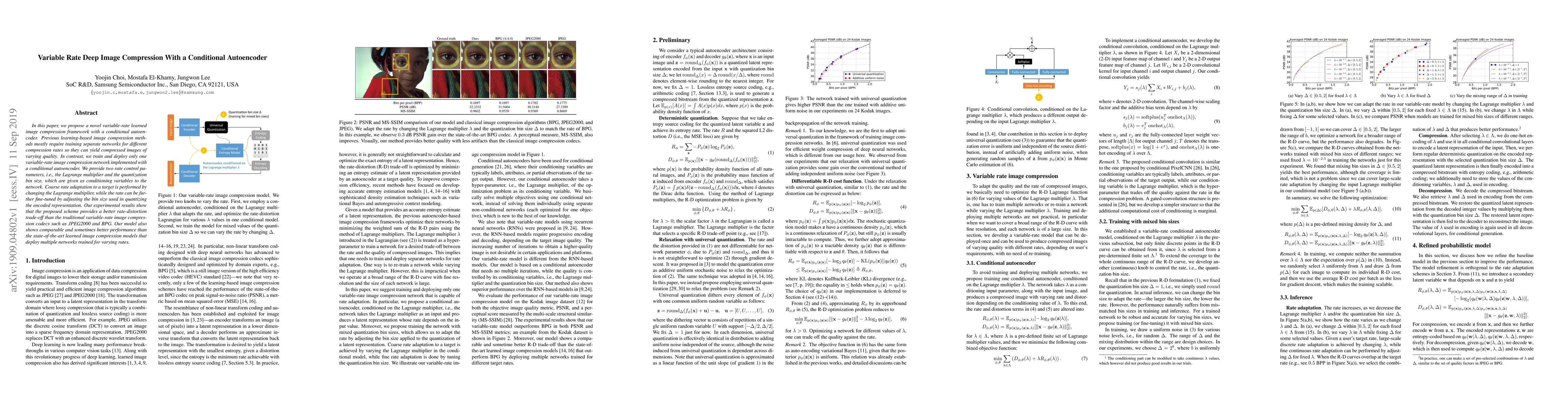 This paper introduces a single variable-rate image compression network using a conditional autoencoder, offering better rate-distortion trade-offs compared to traditional codecs and state-of-the-art models, through adaptive rate control parameters.