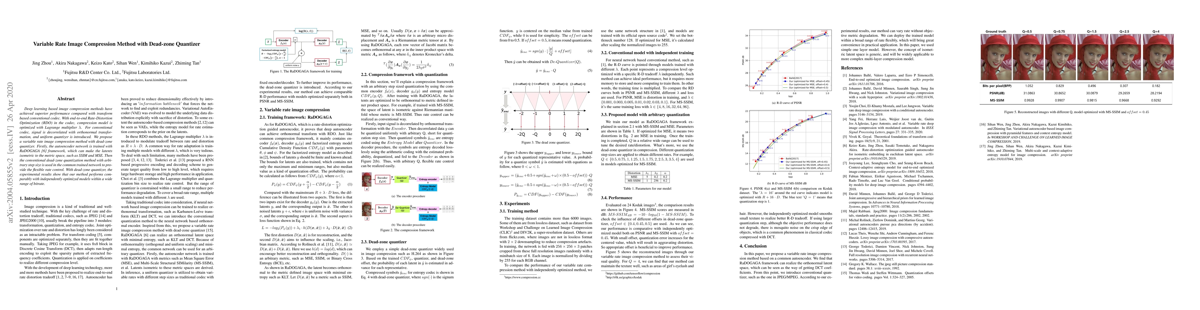 This paper proposes a variable rate image compression method using a deep learning-based autoencoder trained with the RaDOGAGA framework and a dead-zone quantizer for flexible rate control, achieving comparable performance to independently optimized models across various bitrates.