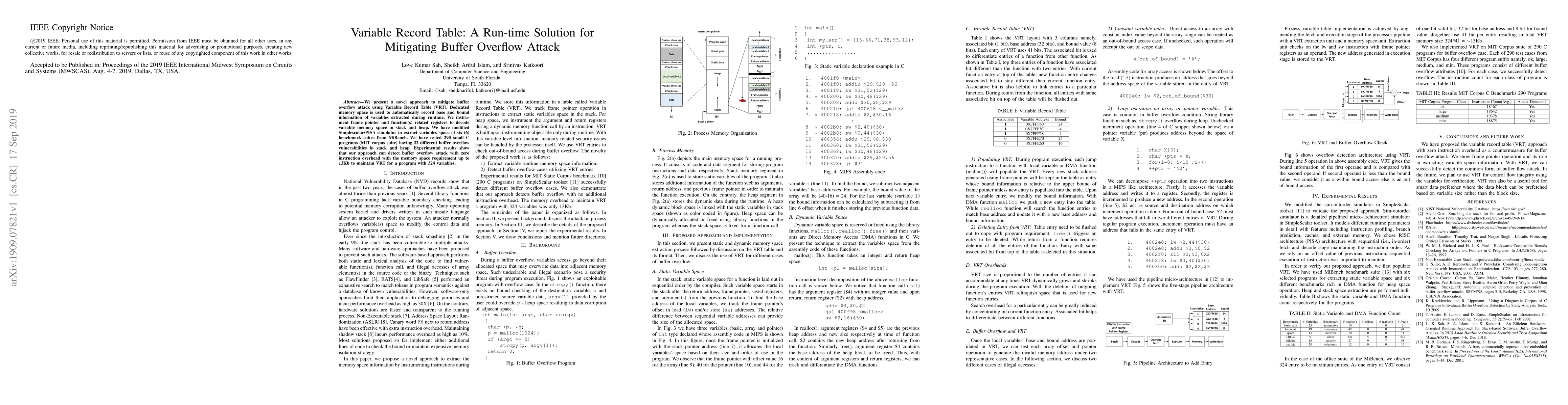 This paper introduces a Variable Record Table (VRT) to mitigate buffer overflow attacks by recording variable base and bound information during runtime. The approach uses dedicated memory and modified Simplescalar/PISA simulator to detect vulnerabilities in 290 C programs, achieving zero instruction overhead with a memory footprint of up to 13Kb.