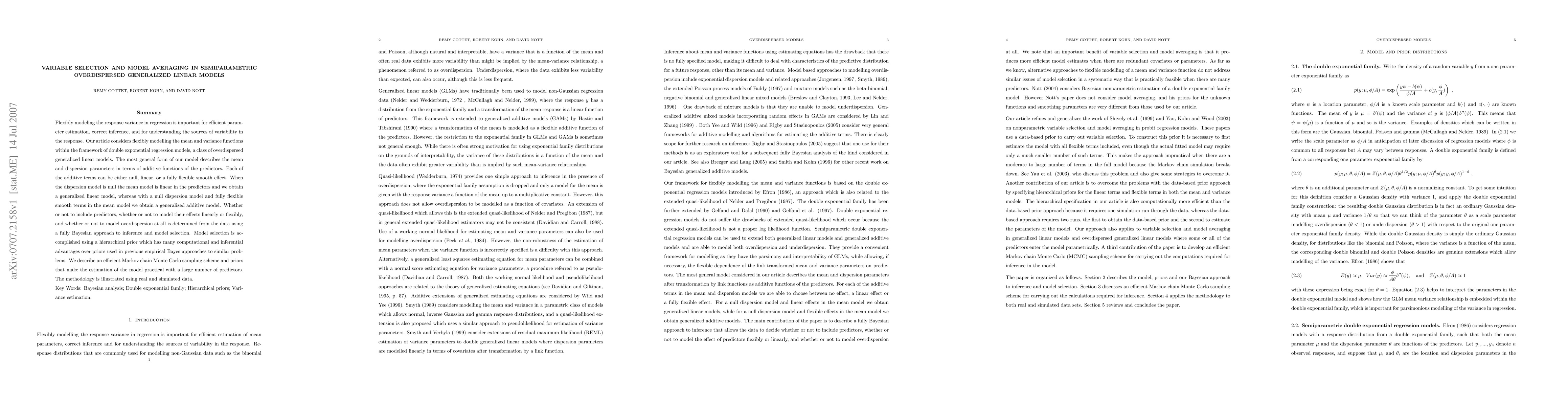 We express the mean and variance terms in a double exponential regression model as additive functions of the predictors and use Bayesian variable selection to determine which predictors enter the model, and whether they enter linearly or flexibly. When the variance term is null we obtain a generalized additive model, which becomes a generalized linear model if the predictors enter the mean linearly. The model is estimated using Markov chain Monte Carlo simulation and the methodology is illustrated using real and simulated data sets.