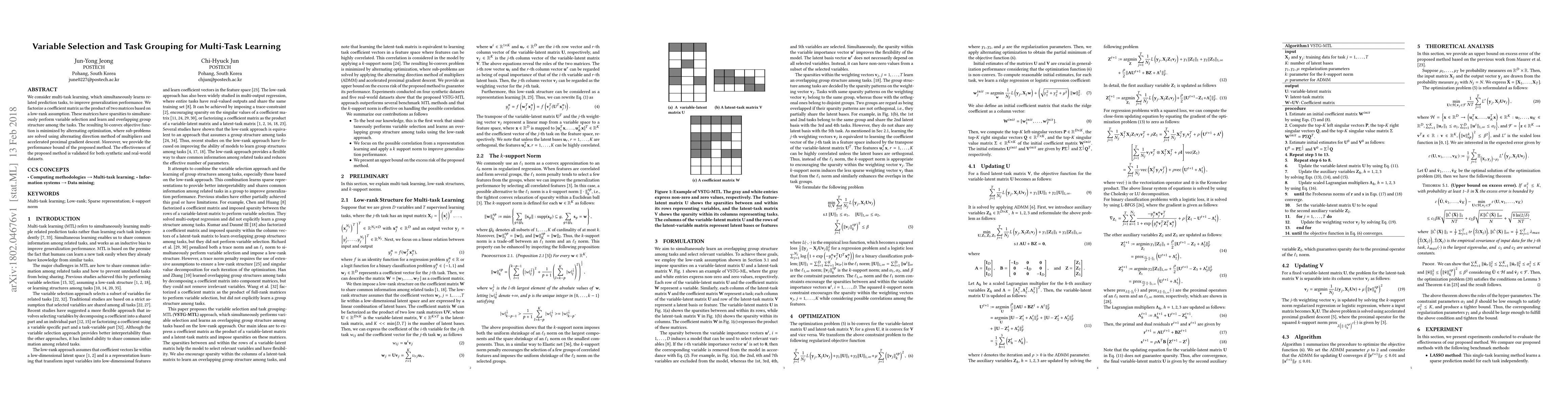 We consider multi-task learning, which simultaneously learns related prediction tasks, to improve generalization performance. We factorize a coefficient matrix as the product of two matrices based on a low-rank assumption. These matrices have sparsities to simultaneously perform variable selection and learn and overlapping group structure among the tasks. The resulting bi-convex objective function is minimized by alternating optimization where sub-problems are solved using alternating direction method of multipliers and accelerated proximal gradient descent. Moreover, we provide the performance bound of the proposed method. The effectiveness of the proposed method is validated for both synthetic and real-world datasets.