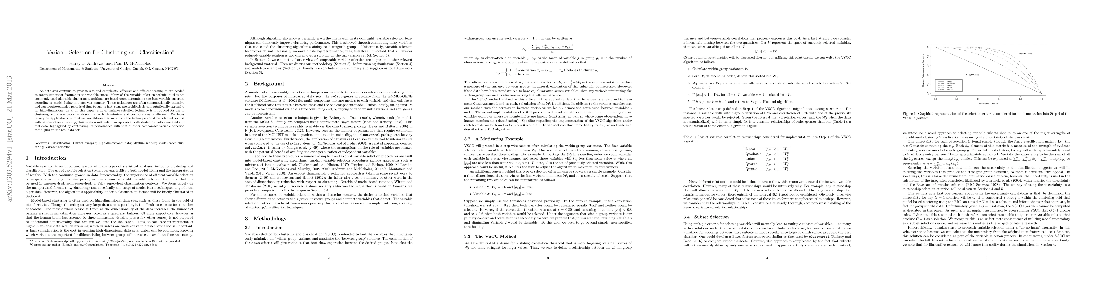 This paper introduces a novel, computationally efficient variable selection technique for clustering and classification, aiming to identify important features in high-dimensional data. The proposed method is demonstrated on both simulated and real datasets, showing improved performance compared to existing stepwise selection approaches.