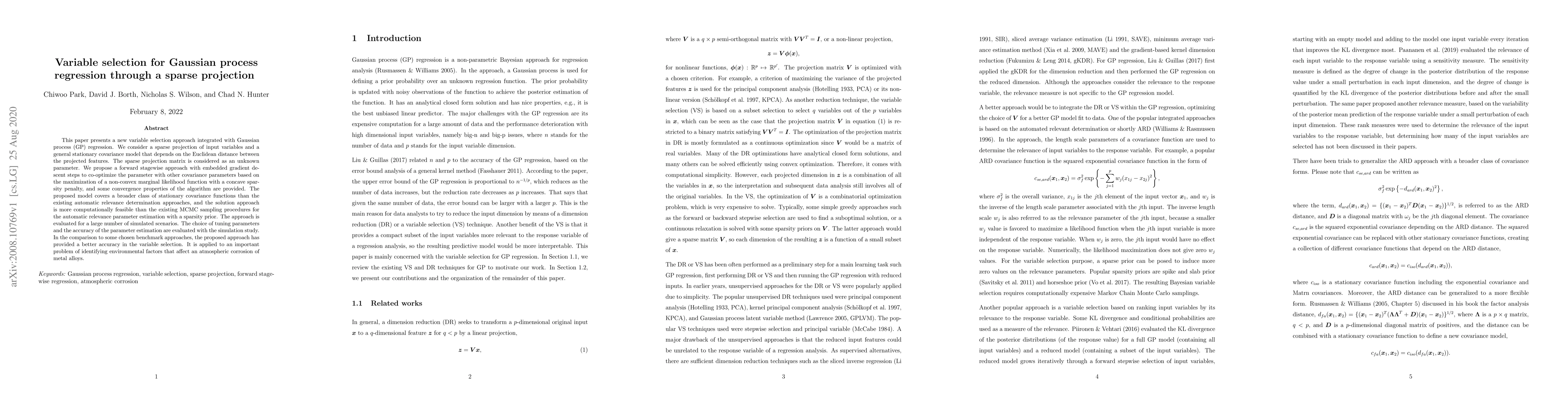 This paper introduces a novel variable selection method for Gaussian process regression using sparse projection, optimizing a non-convex marginal likelihood function with a sparsity penalty. The proposed forward stagewise approach outperforms existing MCMC methods and benchmarks in accuracy for variable selection, demonstrated through simulations and an application to atmospheric corrosion studies.