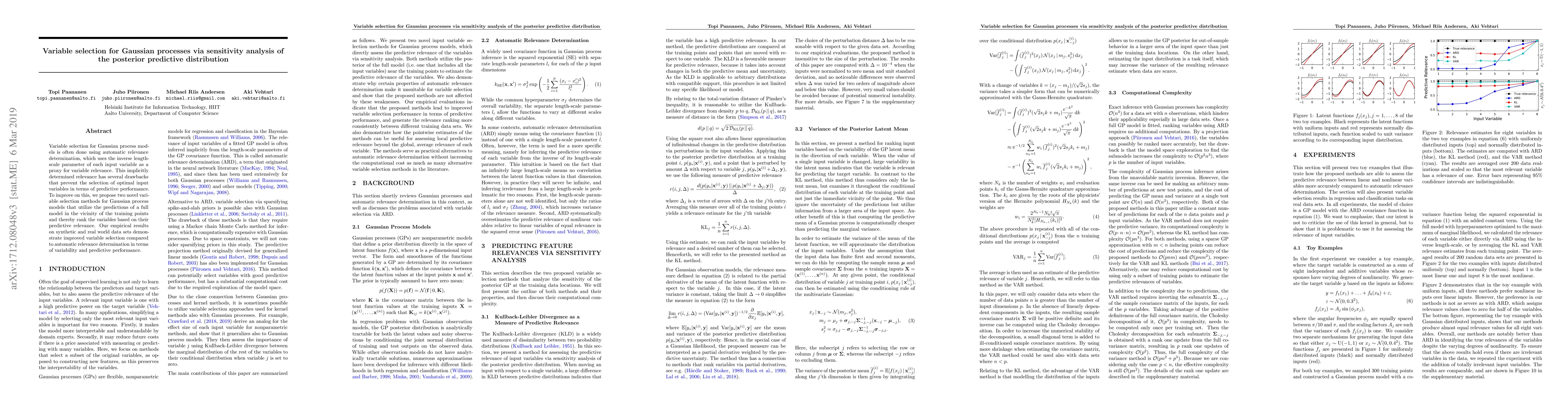 This paper proposes two new variable selection methods for Gaussian process models that assess variable relevance based on the predictive relevance near training points, improving upon automatic relevance determination. Empirical results show better selection in terms of variability and predictive performance on both synthetic and real datasets.
