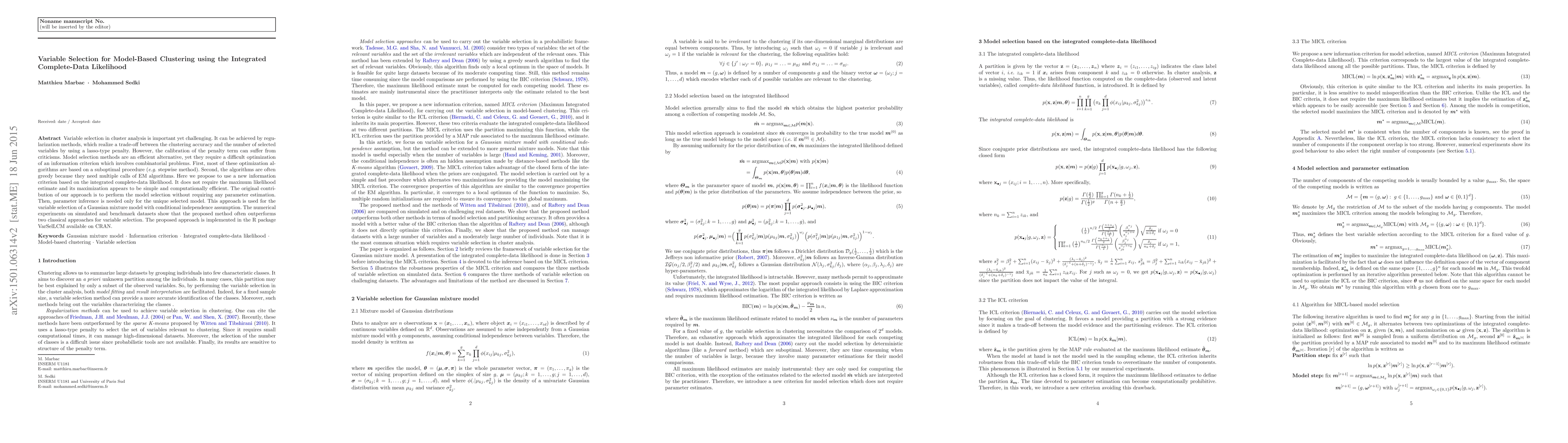 This paper proposes a new method for variable selection in model-based clustering using an information criterion based on the integrated complete-data likelihood, which simplifies model selection without requiring parameter estimation, thus outperforming classical approaches in numerical experiments.