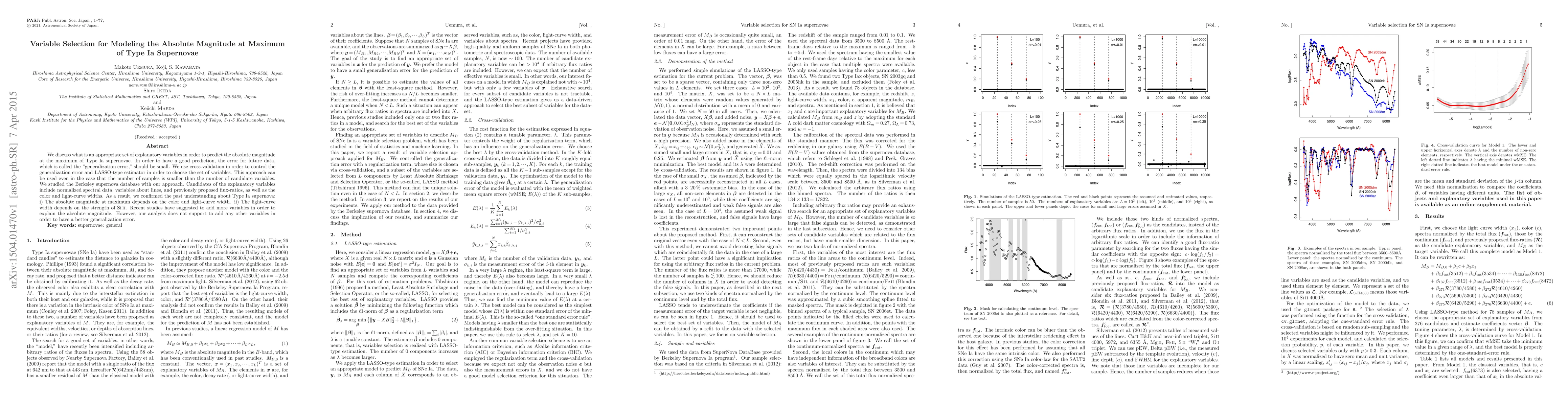 We discuss what is an appropriate set of explanatory variables in order to predict the absolute magnitude at the maximum of Type Ia supernovae. In order to have a good prediction, the error for future data, which is called the "generalization error," should be small. We use cross-validation in order to control the generalization error and LASSO-type estimator in order to choose the set of variables. This approach can be used even in the case that the number of samples is smaller than the number of candidate variables. We studied the Berkeley supernova database with our approach. Candidates of the explanatory variables include normalized spectral data, variables about lines, and previously proposed flux-ratios, as well as the color and light-curve widths. As a result, we confirmed the past understanding about Type Ia supernova: i) The absolute magnitude at maximum depends on the color and light-curve width. ii) The light-curve width depends on the strength of Si II. Recent studies have suggested to add more variables in order to explain the absolute magnitude. However, our analysis does not support to add any other variables in order to have a better generalization error.