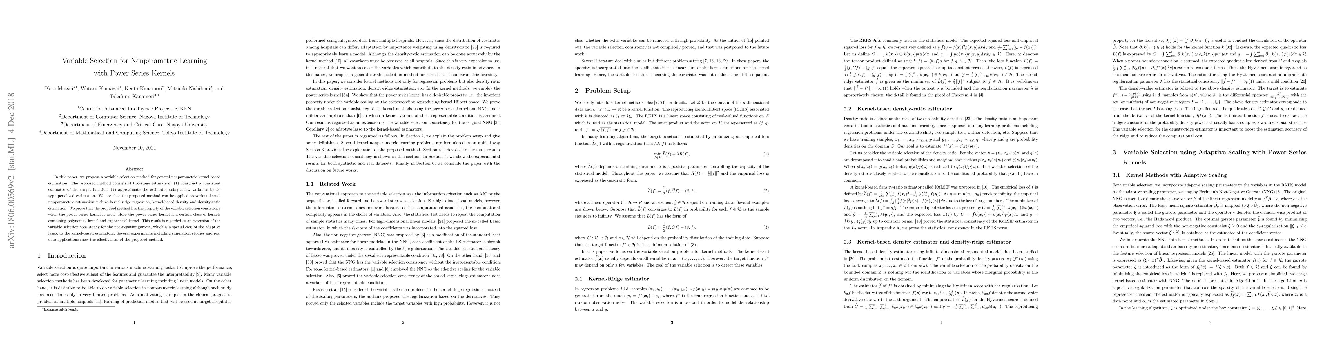 This paper introduces a variable selection method for nonparametric kernel-based estimation using power series kernels, involving two-stage estimation: consistent target function estimation followed by l1-penalized approximation. The method demonstrates variable selection consistency and is applicable to various kernel-based estimations, as validated by simulations and real data applications.