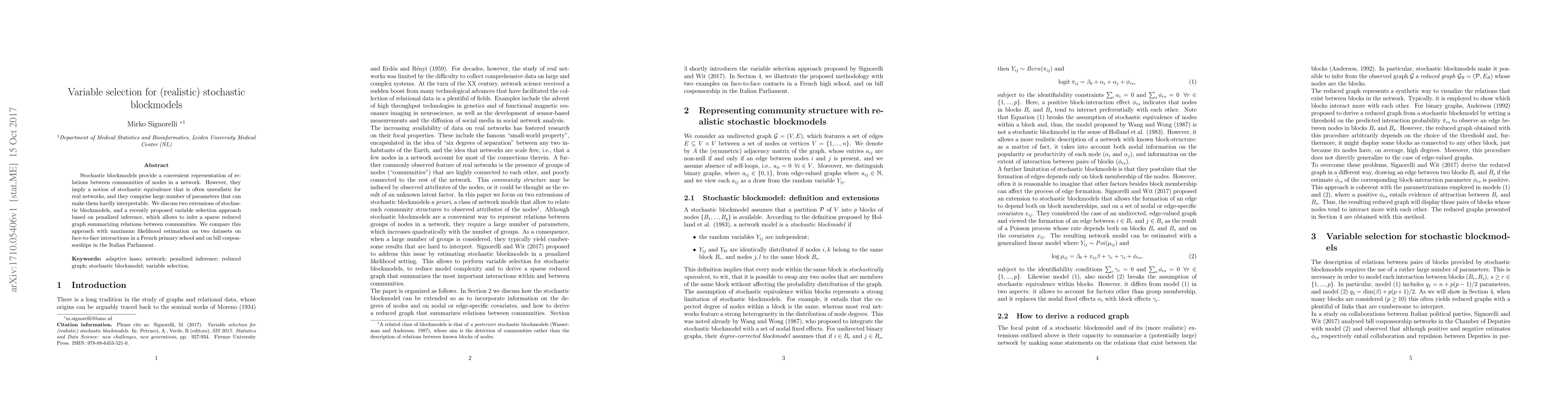 This paper proposes extensions of stochastic blockmodels to better represent real networks and introduces a variable selection approach based on penalized inference to infer a sparse graph. The method is compared to maximum likelihood estimation using datasets from a French primary school and the Italian Parliament.