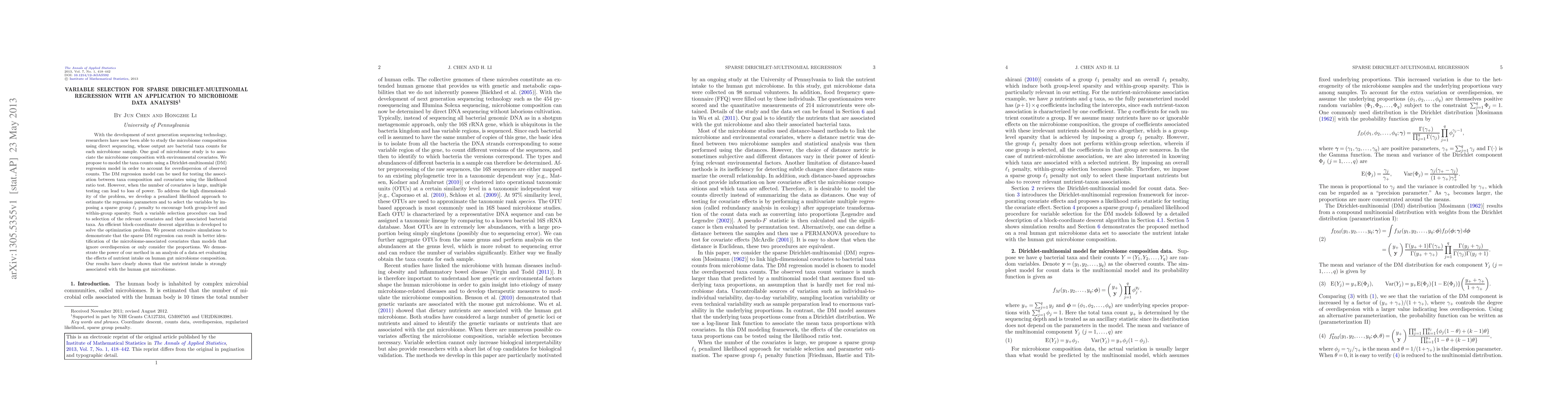 This paper proposes a sparse Dirichlet-multinomial regression model to address overdispersion in microbiome data, employing a penalized likelihood approach with a sparse group $\ell_1$ penalty for variable selection. The method is shown to better identify microbiome-associated covariates compared to traditional models, demonstrated through simulations and an analysis of nutrient intake effects on human gut microbiome composition.