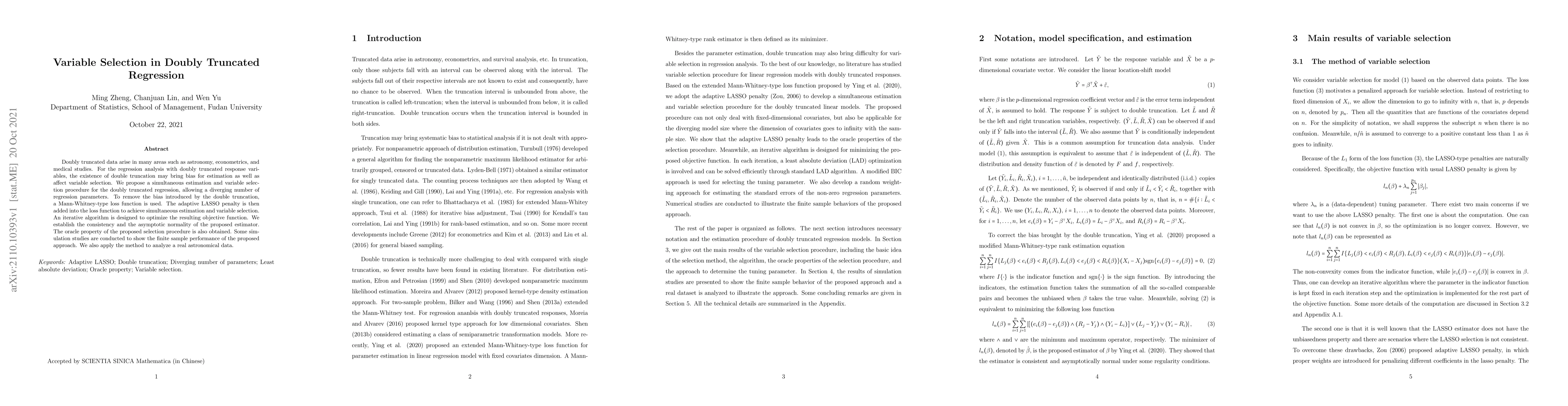 This paper proposes a method for simultaneous estimation and variable selection in doubly truncated regression, addressing potential biases introduced by double truncation. It utilizes a Mann-Whitney-type loss function and adaptive LASSO penalty, supported by an iterative algorithm, and demonstrates consistency and asymptotic normality of the estimator through theoretical analysis and simulation studies.