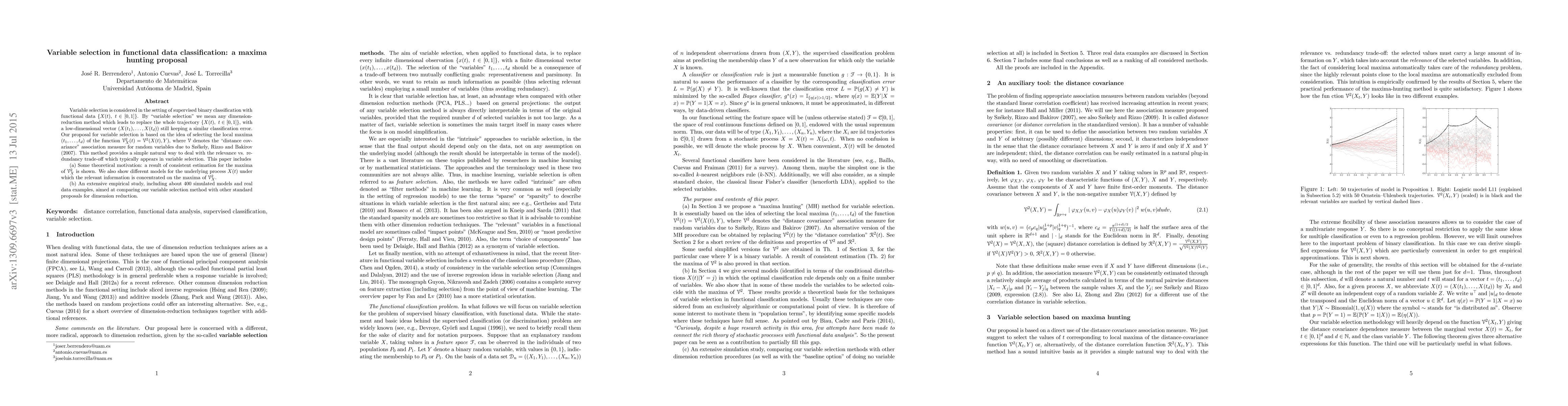 Variable selection is considered in the setting of supervised binary classification with functional data $\{X(t),\ t\in[0,1]\}$. By "variable selection" we mean any dimension-reduction method which leads to replace the whole trajectory $\{X(t),\ t\in[0,1]\}$, with a low-dimensional vector $(X(t_1),\ldots,X(t_k))$ still keeping a similar classification error. Our proposal for variable selection is based on the idea of selecting the local maxima $(t_1,\ldots,t_k)$ of the function ${\mathcal V}_X^2(t)={\mathcal V}^2(X(t),Y)$, where ${\mathcal V}$ denotes the "distance covariance" association measure for random variables due to Sz\'ekely, Rizzo and Bakirov (2007). This method provides a simple natural way to deal with the relevance vs. redundancy trade-off which typically appears in variable selection. This paper includes (a) Some theoretical motivation: a result of consistent estimation on the maxima of ${\mathcal V}_X^2$ is shown. We also show different theoretical models for the underlying process $X(t)$ under which the relevant information in concentrated in the maxima of ${\mathcal V}_X^2$. (b) An extensive empirical study, including about 400 simulated models and real data examples, aimed at comparing our variable selection method with other standard proposals for dimension reduction.