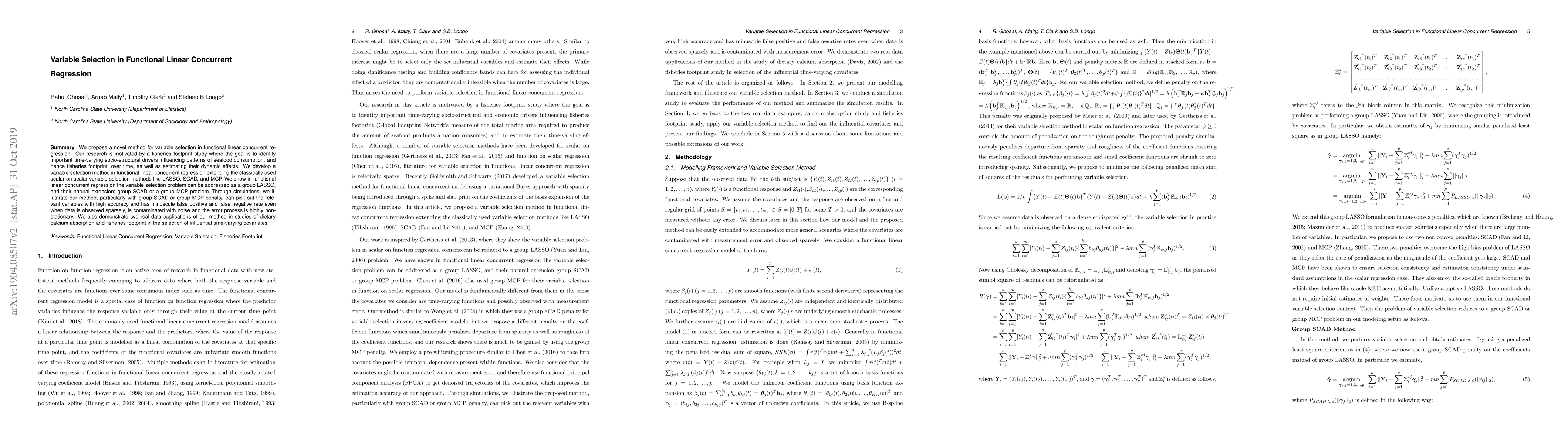 We propose a novel method for variable selection in functional linear concurrent regression. Our research is motivated by a fisheries footprint study where the goal is to identify important time-varying socio-structural drivers influencing patterns of seafood consumption, and hence fisheries footprint, over time, as well as estimating their dynamic effects. We develop a variable selection method in functional linear concurrent regression extending the classically used scalar on scalar variable selection methods like LASSO, SCAD, and MCP. We show in functional linear concurrent regression the variable selection problem can be addressed as a group LASSO, and their natural extension; group SCAD or a group MCP problem. Through simulations, we illustrate our method, particularly with group SCAD or group MCP penalty, can pick out the relevant variables with high accuracy and has minuscule false positive and false negative rate even when data is observed sparsely, is contaminated with noise and the error process is highly non-stationary. We also demonstrate two real data applications of our method in studies of dietary calcium absorption and fisheries footprint in the selection of influential time-varying covariates.