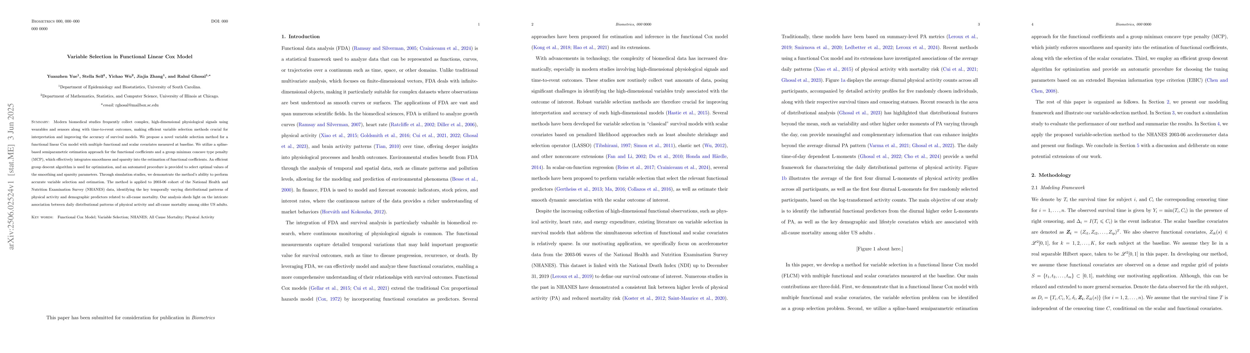 This paper proposes a novel variable selection method for functional linear Cox models that accurately selects key temporally varying patterns of physical activity and demographic predictors related to mortality in older adults. The method uses a spline-based semiparametric estimation approach with a group minimax concave type penalty and demonstrates its performance through simulation studies and application to real-world NHANES data.