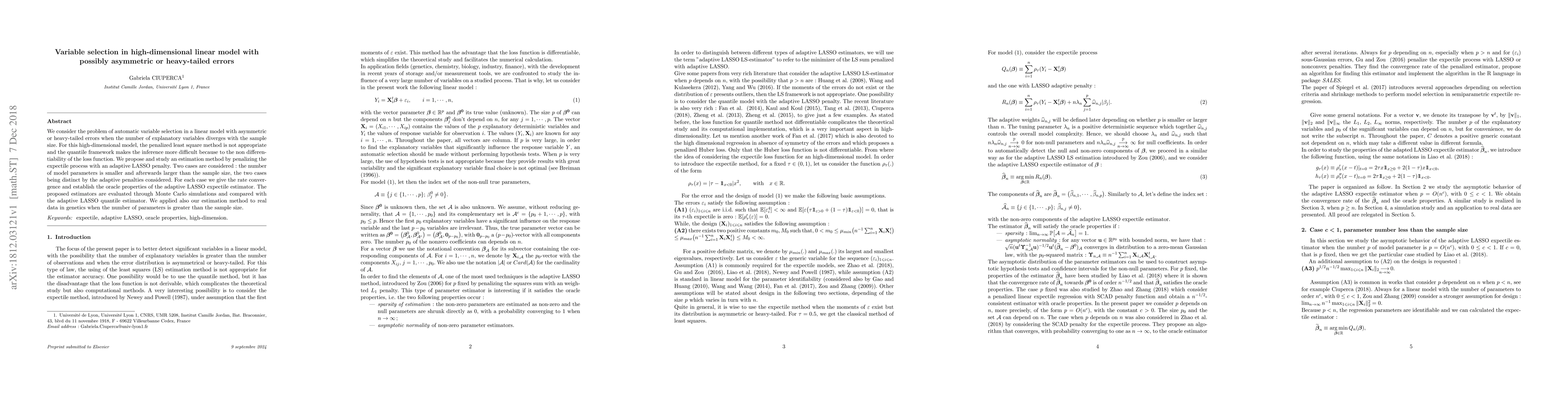 This paper proposes an adaptive LASSO penalization method for variable selection in high-dimensional linear models with asymmetric or heavy-tailed errors, addressing challenges due to non-differentiability. The method is evaluated through simulations and applied to genetic data, demonstrating its effectiveness compared to the adaptive LASSO quantile estimator.
