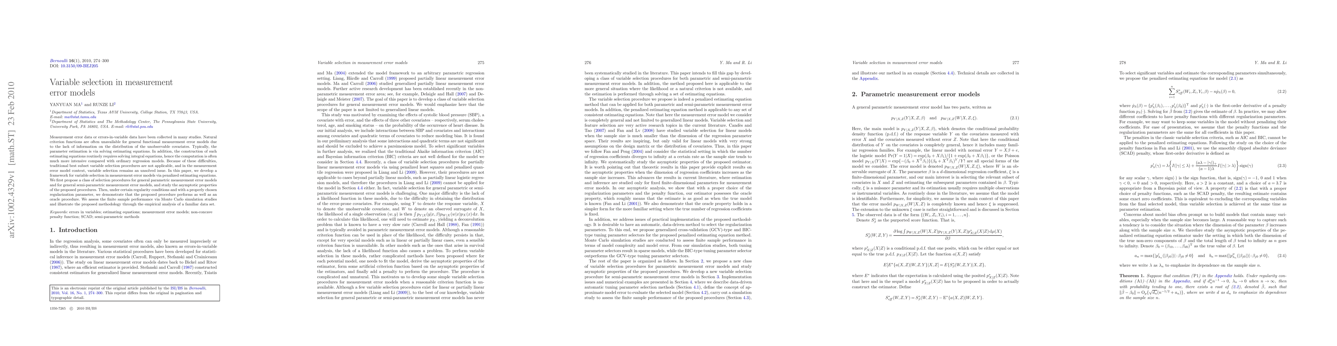 This paper develops a framework for variable selection in measurement error models using penalized estimating equations, proposing selection procedures for both parametric and semi-parametric models and demonstrating their asymptotic properties. The proposed method is shown to perform competitively with an oracle procedure through Monte Carlo simulations and an empirical analysis.
