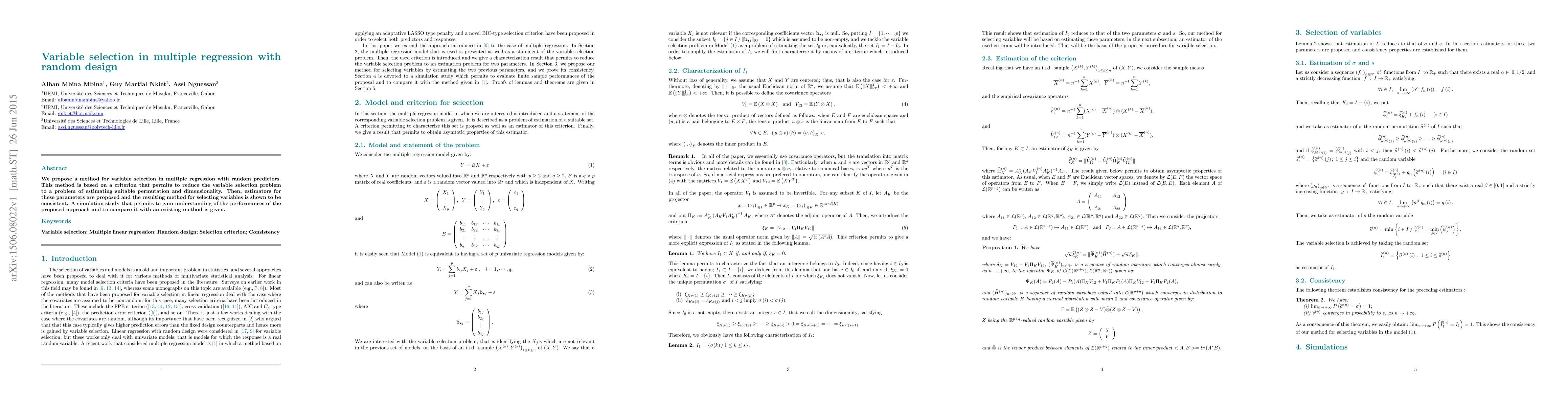 This paper introduces a new method for variable selection in multiple regression with random predictors, reducing the problem to permutation and dimensionality estimation. Simulation results demonstrate the method's consistency and compare its performance with an existing approach.