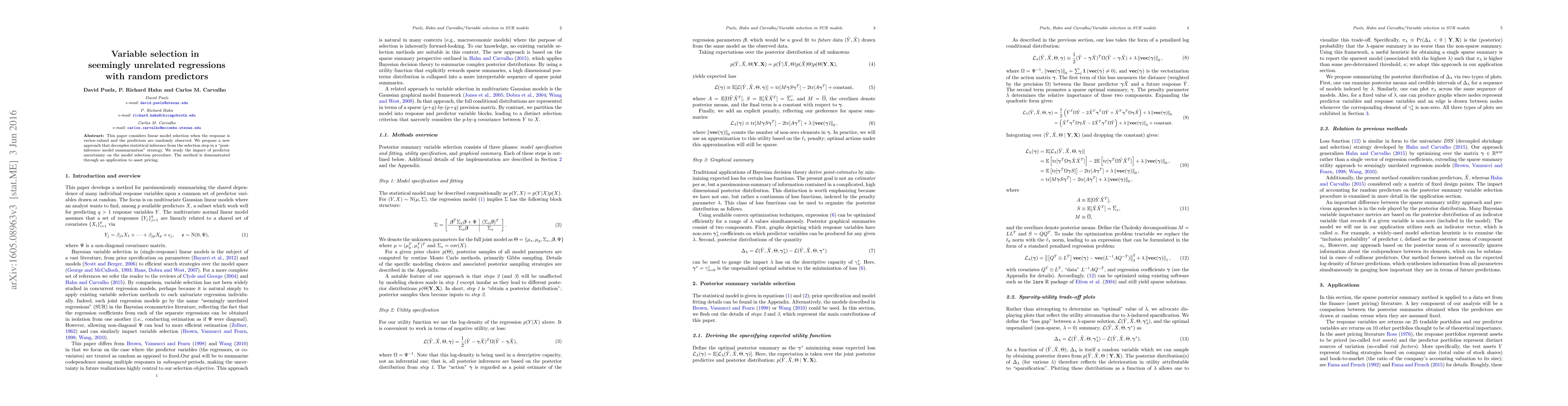 This paper introduces a novel approach for selecting variables in seemingly unrelated regressions with randomly observed predictors, employing a "post-inference model summarization" strategy that separates statistical inference from selection. The method is applied to asset pricing to demonstrate its effectiveness.