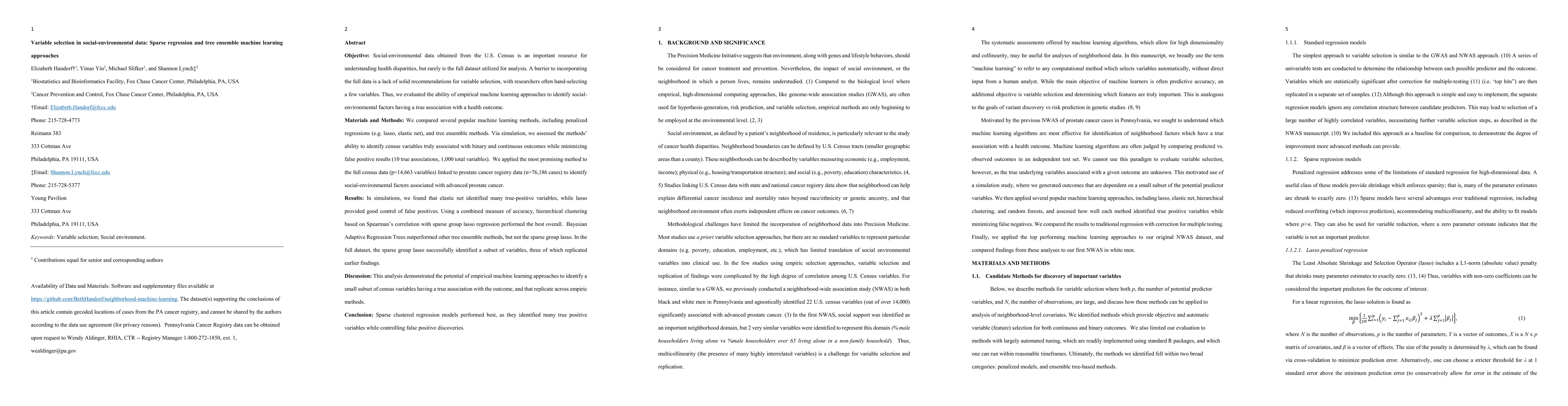 This study evaluates machine learning methods for variable selection in social-environmental data linked to health outcomes, finding that sparse group lasso regression and Bayesian Adaptive Regression Trees are effective in identifying true associations while minimizing false positives. The methods were applied to U.S. Census data to identify factors linked to advanced prostate cancer.
