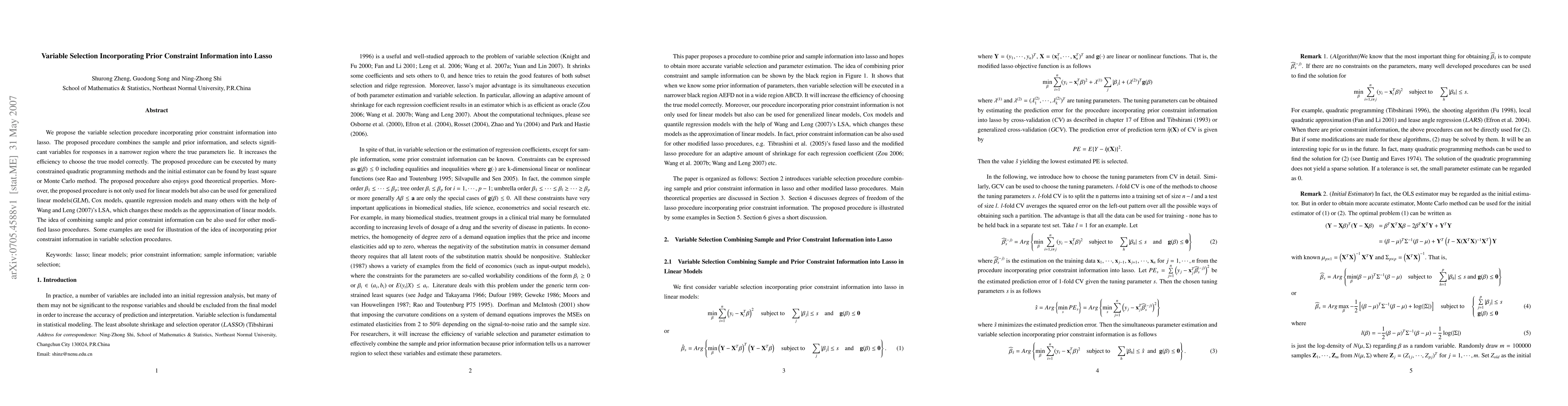 This paper introduces a new variable selection method that integrates prior constraint information into the lasso procedure. By combining sample data with prior knowledge, the method improves model selection efficiency and accuracy, maintaining theoretical robustness across various models, including GLMs, Cox, and quantile regression models.
