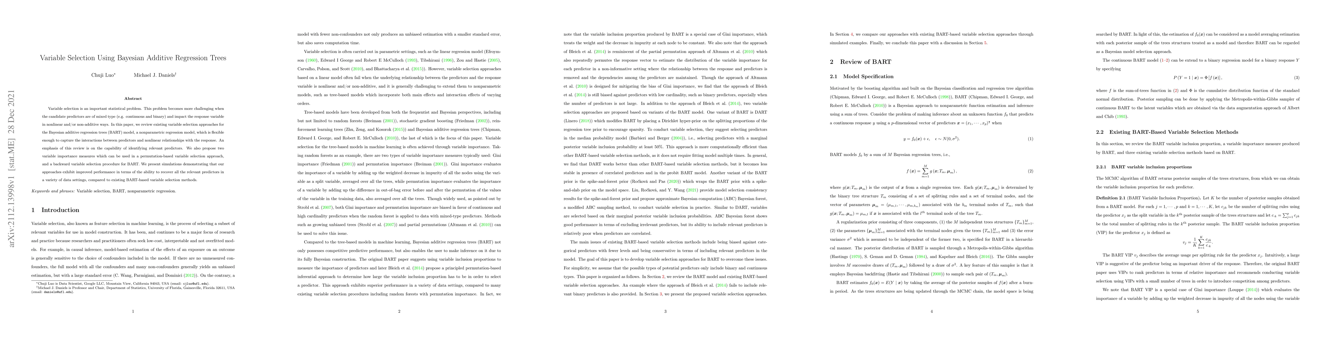 This paper reviews existing variable selection methods for Bayesian Additive Regression Trees (BART) and proposes new variable importance measures and a backward selection procedure. Simulation results show improved performance in identifying relevant predictors compared to current methods.