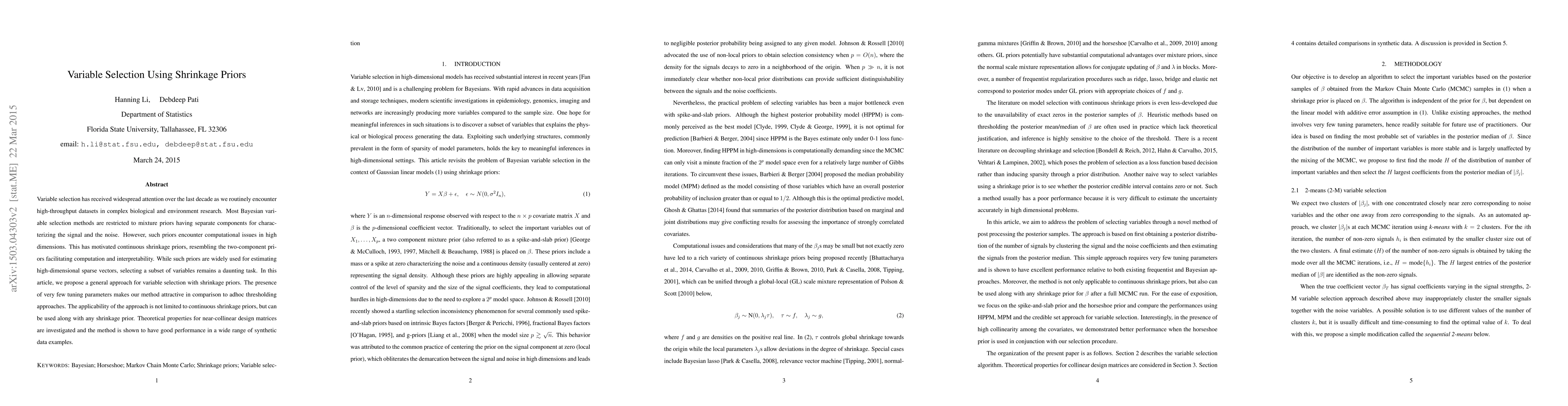 This paper proposes a novel method for variable selection using shrinkage priors, addressing computational challenges in high-dimensional data. The approach features few tuning parameters and is versatile, applicable to various shrinkage priors, and demonstrates strong performance in synthetic data tests.