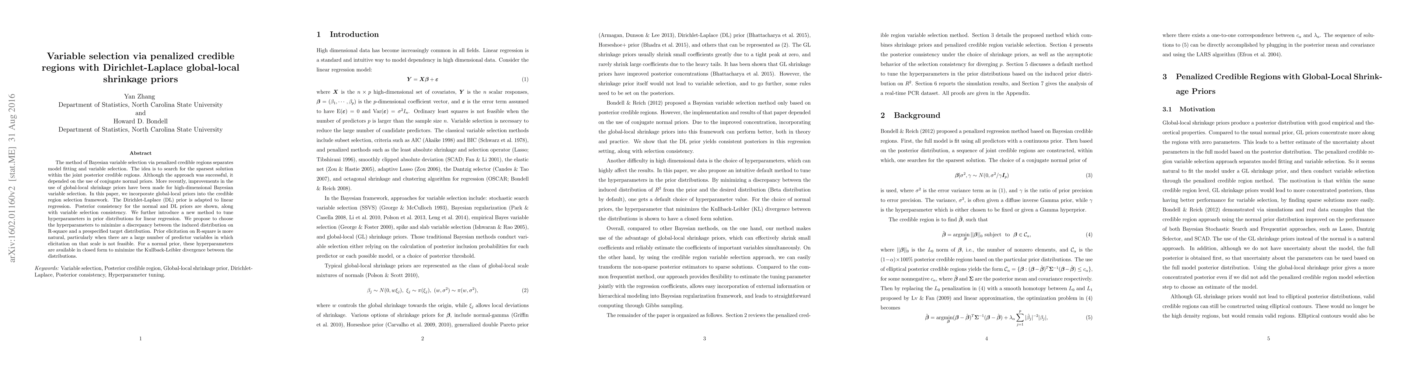 This paper introduces a Bayesian variable selection method using penalized credible regions with Dirichlet-Laplace global-local shrinkage priors for linear regression. It demonstrates posterior consistency and variable selection consistency, and proposes a new hyperparameter tuning method based on minimizing the discrepancy between the induced R-square distribution and a target distribution.