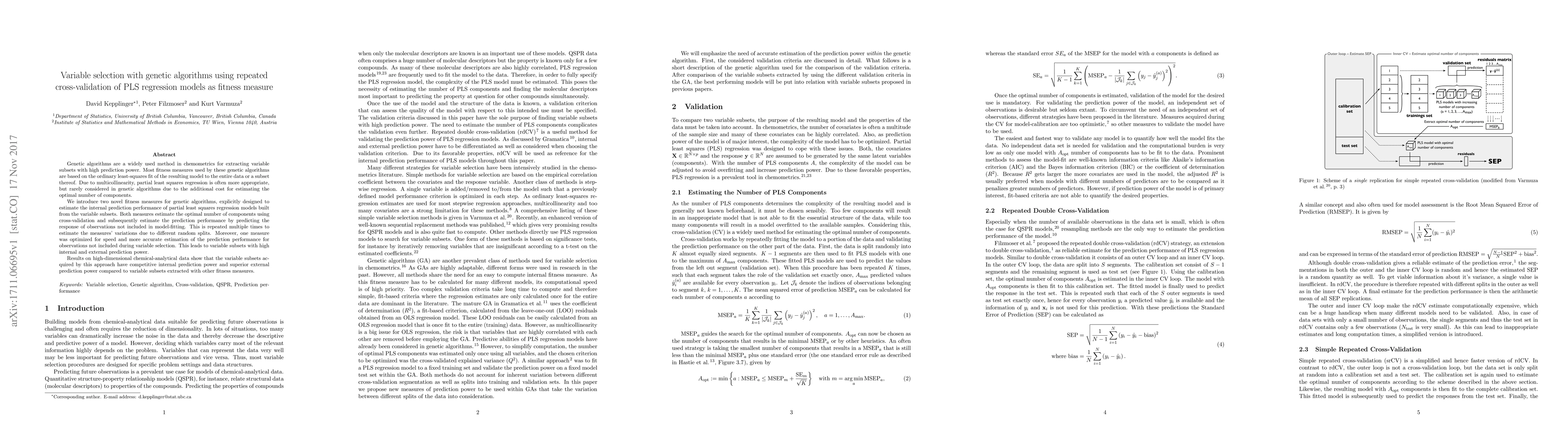 This paper introduces novel fitness measures for genetic algorithms that utilize repeated cross-validation of PLS regression to select variable subsets with high prediction power, addressing multicollinearity issues. The proposed measures outperform traditional methods in both internal and external prediction performance on high-dimensional chemical-analytical data.