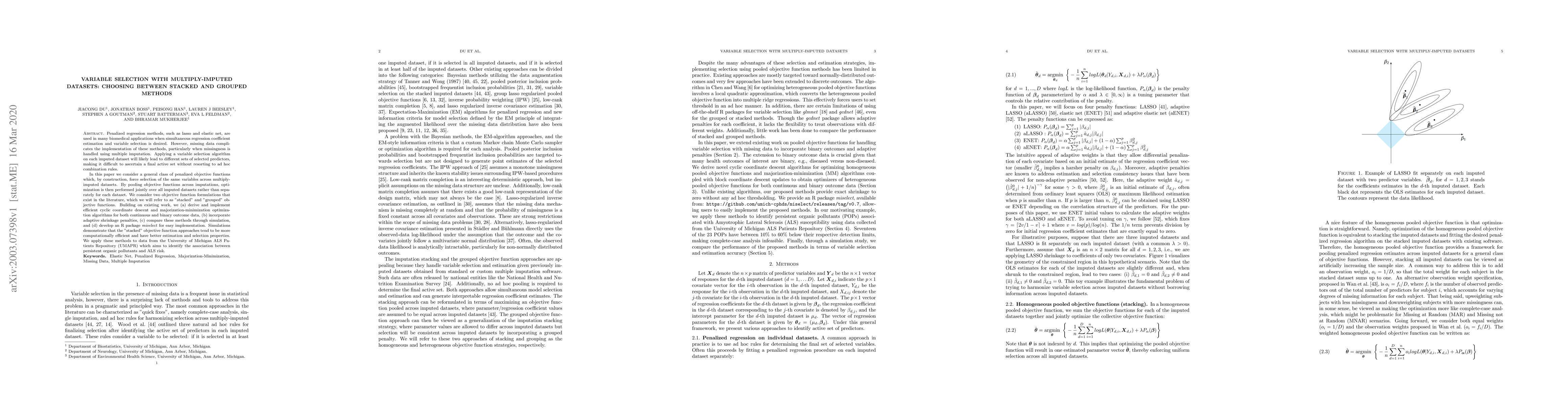 This paper proposes penalized regression methods for variable selection in multiply-imputed datasets, comparing "stacked" and "grouped" objective functions. Simulation results show that "stacked" methods are more efficient and perform better, and an R package, miselect, is developed for implementation.