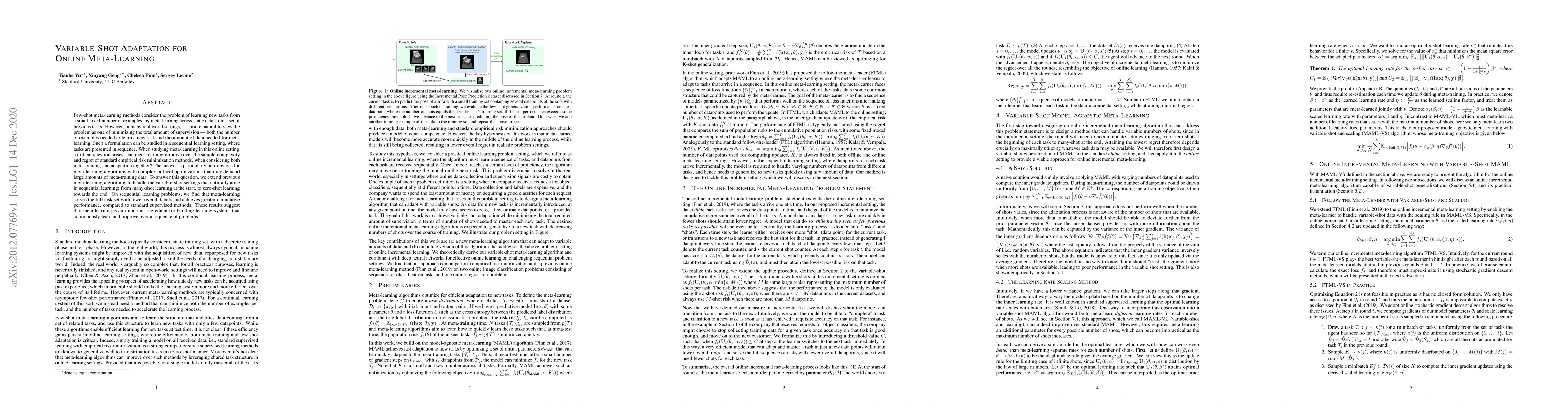 Few-shot meta-learning methods consider the problem of learning new tasks from a small, fixed number of examples, by meta-learning across static data from a set of previous tasks. However, in many real world settings, it is more natural to view the problem as one of minimizing the total amount of supervision --- both the number of examples needed to learn a new task and the amount of data needed for meta-learning. Such a formulation can be studied in a sequential learning setting, where tasks are presented in sequence. When studying meta-learning in this online setting, a critical question arises: can meta-learning improve over the sample complexity and regret of standard empirical risk minimization methods, when considering both meta-training and adaptation together? The answer is particularly non-obvious for meta-learning algorithms with complex bi-level optimizations that may demand large amounts of meta-training data. To answer this question, we extend previous meta-learning algorithms to handle the variable-shot settings that naturally arise in sequential learning: from many-shot learning at the start, to zero-shot learning towards the end. On sequential learning problems, we find that meta-learning solves the full task set with fewer overall labels and achieves greater cumulative performance, compared to standard supervised methods. These results suggest that meta-learning is an important ingredient for building learning systems that continuously learn and improve over a sequence of problems.