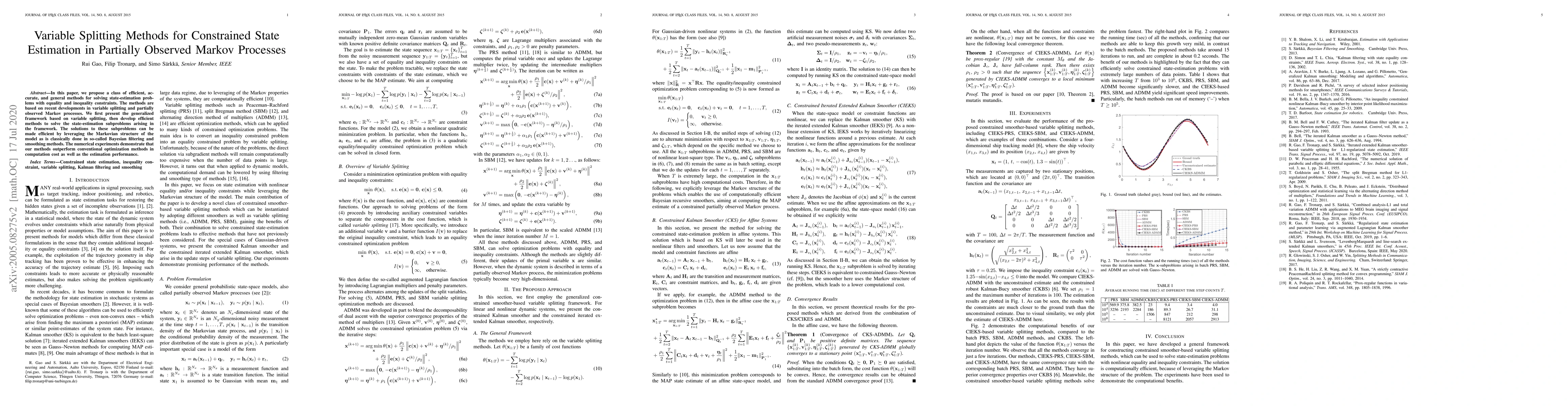 This paper introduces efficient variable splitting methods for constrained state estimation in partially observed Markov processes, leveraging the Markovian structure to enhance computational efficiency and estimation performance, outperforming conventional optimization techniques. Numerical experiments validate the improved accuracy and reduced computation costs of the proposed methods.