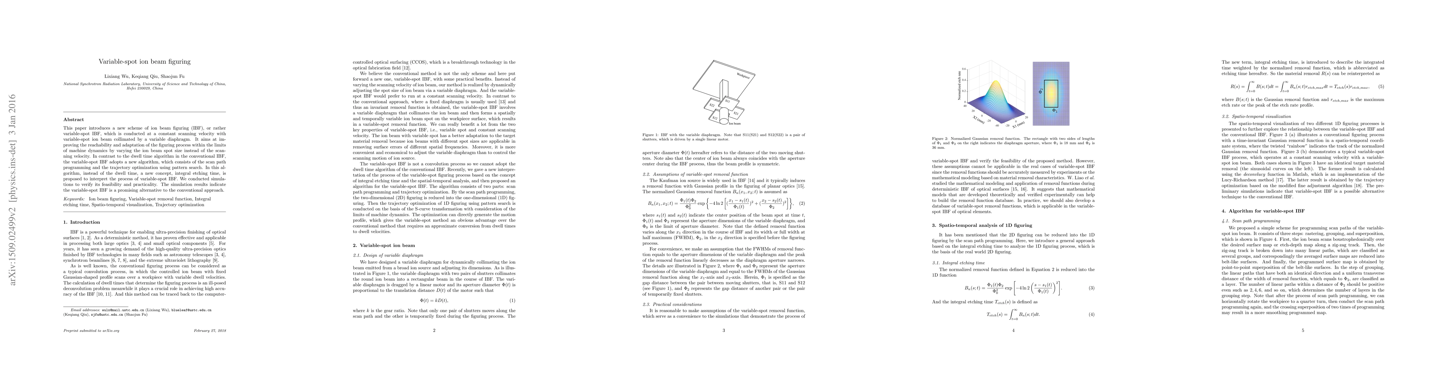 This paper introduces a new scheme of ion beam figuring (IBF), or rather variable-spot IBF, which is conducted at a constant scanning velocity with variable-spot ion beam collimated by a variable diaphragm. It aims at improving the reachability and adaptation of the figuring process within the limits of machine dynamics by varying the ion beam spot size instead of the scanning velocity. In contrast to the dwell time algorithm in the conventional IBF, the variable-spot IBF adopts a new algorithm, which consists of the scan path programming and the trajectory optimization using pattern search. In this algorithm, instead of the dwell time, a new concept, integral etching time, is proposed to interpret the process of variable-spot IBF. We conducted simulations to verify its feasibility and practicality. The simulation results indicate the variable-spot IBF is a promising alternative to the conventional approach.