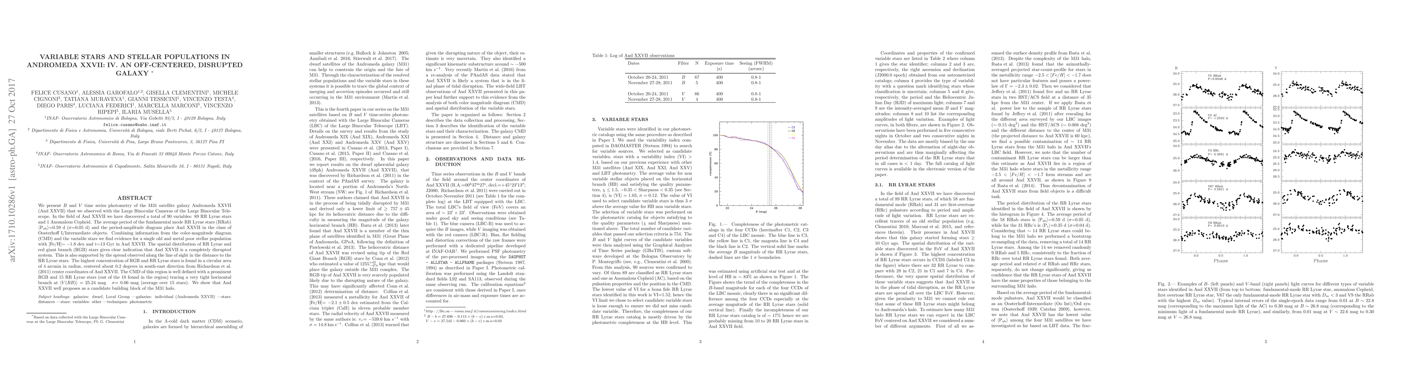 We present B and V time series photometry of the M31 satellite galaxy Andromeda XXVII (And XXVII) that we observed with the Large Binocular Cameras of the Large Binocular Telescope. In the field of And XXVII we have discovered a total of 90 variables: 89 RR Lyrae stars and 1 Anomalous Cepheid. The average period of the fundamental mode RR Lyrae stars (RRab) $\langle$P$_{\rm ab}\rangle$=0.59 d ($\sigma$=0.05 d) and the period-amplitude diagram place And XXVII in the class of Oosterhoff I/Intermediate objects. Combining information from the color-magnitude diagram (CMD) and the variable stars we find evidence for a single old and metal poor stellar population with [Fe/H]$\sim -1.8$ dex and t$\sim$13 Gyr in And XXVII. The spatial distribution of RR Lyrae and red giant branch (RGB) stars gives clear indication that And XXVII is a completely disrupted system. This is also supported by the spread observed along the line of sight in the distance to the RR Lyrae stars. The highest concentration of RGB and RR Lyrae stars is found in a circular area of 4 arcmin in radius, centered about 0.2 degrees in south-east direction from Richardson et al. (2011) center coordinates of And XXVII. The CMD of this region is well defined with a prominent RGB and 15 RR Lyrae stars (out of the 18 found in the region) tracing a very tight horizontal branch at $\langle V(RR) \rangle$ = 25.24 mag $\sigma$= 0.06 mag (average over 15 stars). We show that And XXVII well proposes as a candidate building block of the M31 halo.