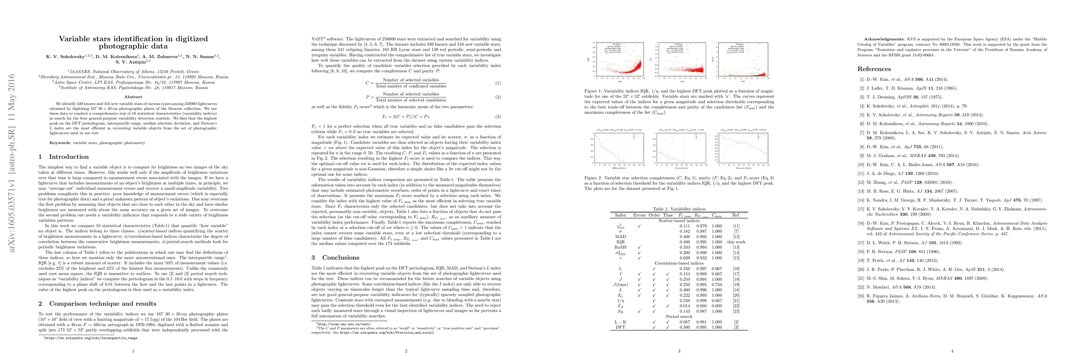 We identify 339 known and 316 new variable stars of various types among 250000 lightcurves obtained by digitizing 167 30x30cm photographic plates of the Moscow collection. We use these data to conduct a comprehensive test of 18 statistical characteristics (variability indices) in search for the best general-purpose variability detection statistic. We find that the highest peak on the DFT periodogram, interquartile range, median absolute deviation, and Stetson's L index are the most efficient in recovering variable objects from the set of photographic lightcurves used in our test.