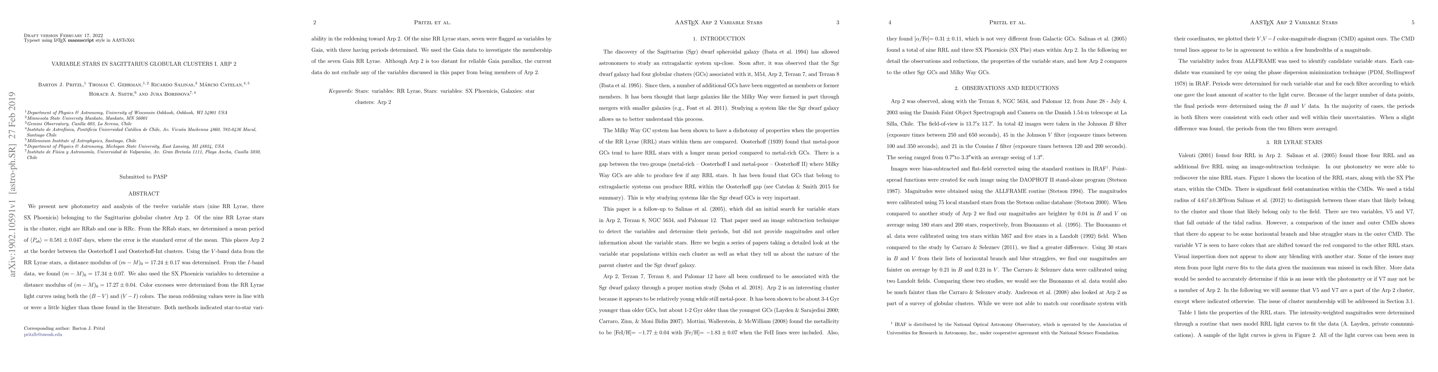 This paper analyzes twelve variable stars in the Sagittarius globular cluster Arp 2, determining a mean period for RRab stars and a distance modulus of $(m-M)_0=17.24\pm0.17$ using RR Lyrae stars, with additional confirmation from SX Phoenicis variables and reddening analysis. Gaia data suggests all discussed variables could be members of Arp 2.