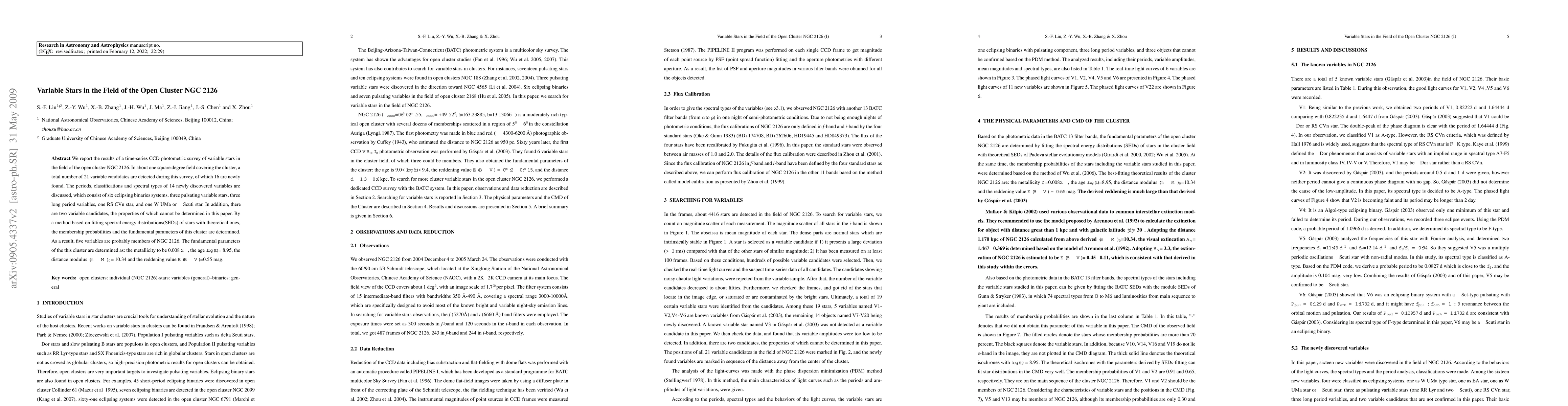 A time-series survey of 21 variable stars in the open cluster NGC 2126 discovered 16 new variables, including eclipsing binaries and pulsating stars, with membership probabilities determined for five stars. The cluster's fundamental parameters were also found to be a metallicity of 0.008 $Z_�$, an age of 8.95 billion years, and a distance modulus of 10.34.