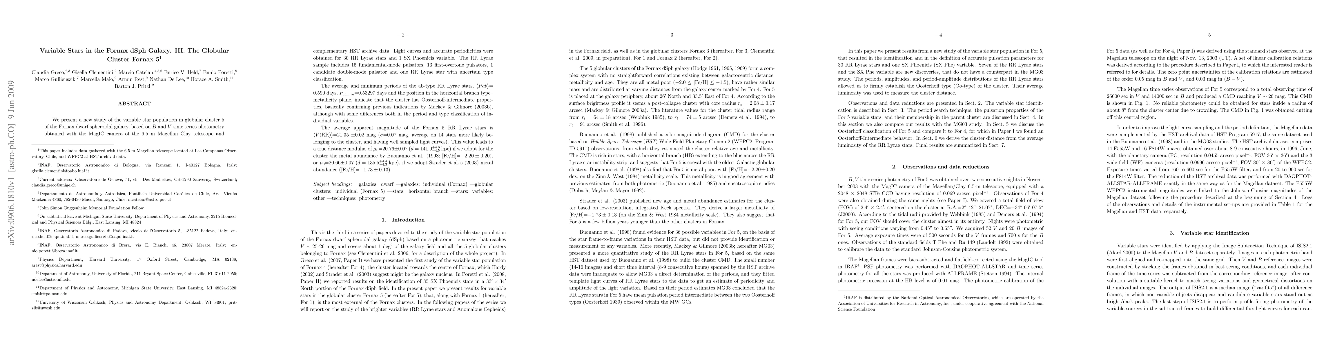 This study analyzes variable stars in the globular cluster Fornax 5 of the Fornax dSph galaxy, identifying 30 RR Lyrae stars and 1 SX Phoenicis variable. The cluster exhibits Oosterhoff-intermediate properties, and the derived distance modulus suggests a distance of 141.9 kpc, depending on the adopted metal abundance.