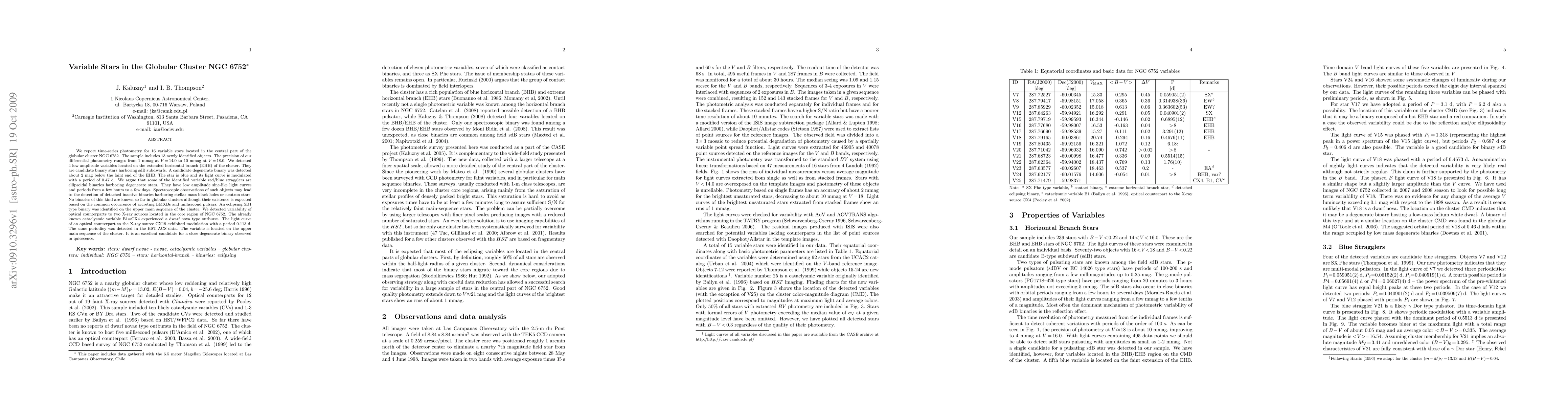 The study utilized time-series photometry for 16 variable stars in the central part of the globular cluster NGC 6752, with 13 newly identified objects. Precision of photometry ranges from 1 mmag to 10 mmag.